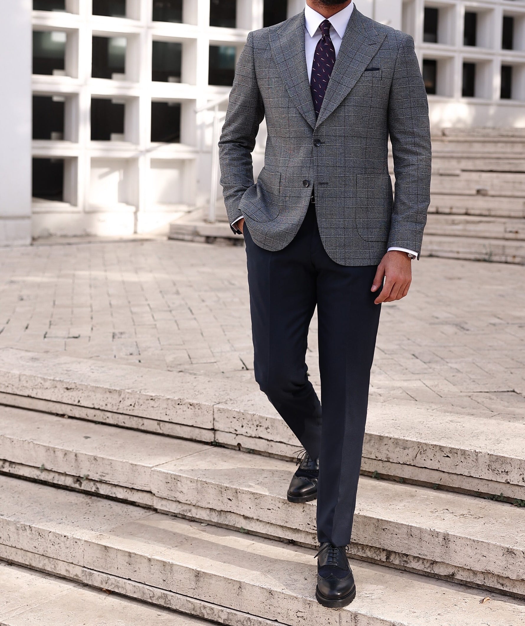 A grey checked blazer paired with black trousers is a classic and stylish combination for any occasion. The grey checked blazer adds a touch of texture and pattern to the outfit, while the black trousers provide a sleek and sophisticated base. This combination is perfect for both casual and formal occasions, and can be dressed up or down with the right accessories and shoes.