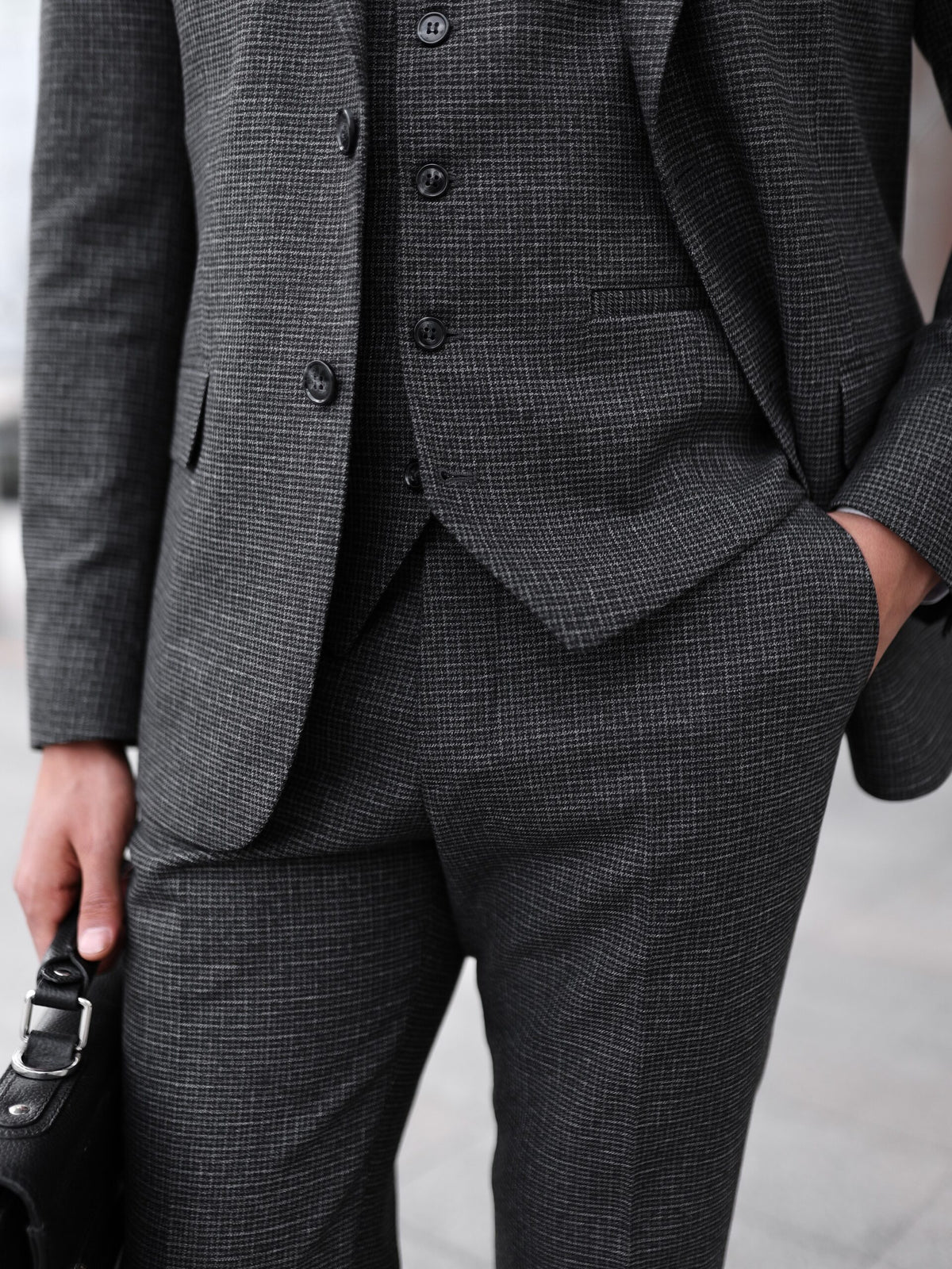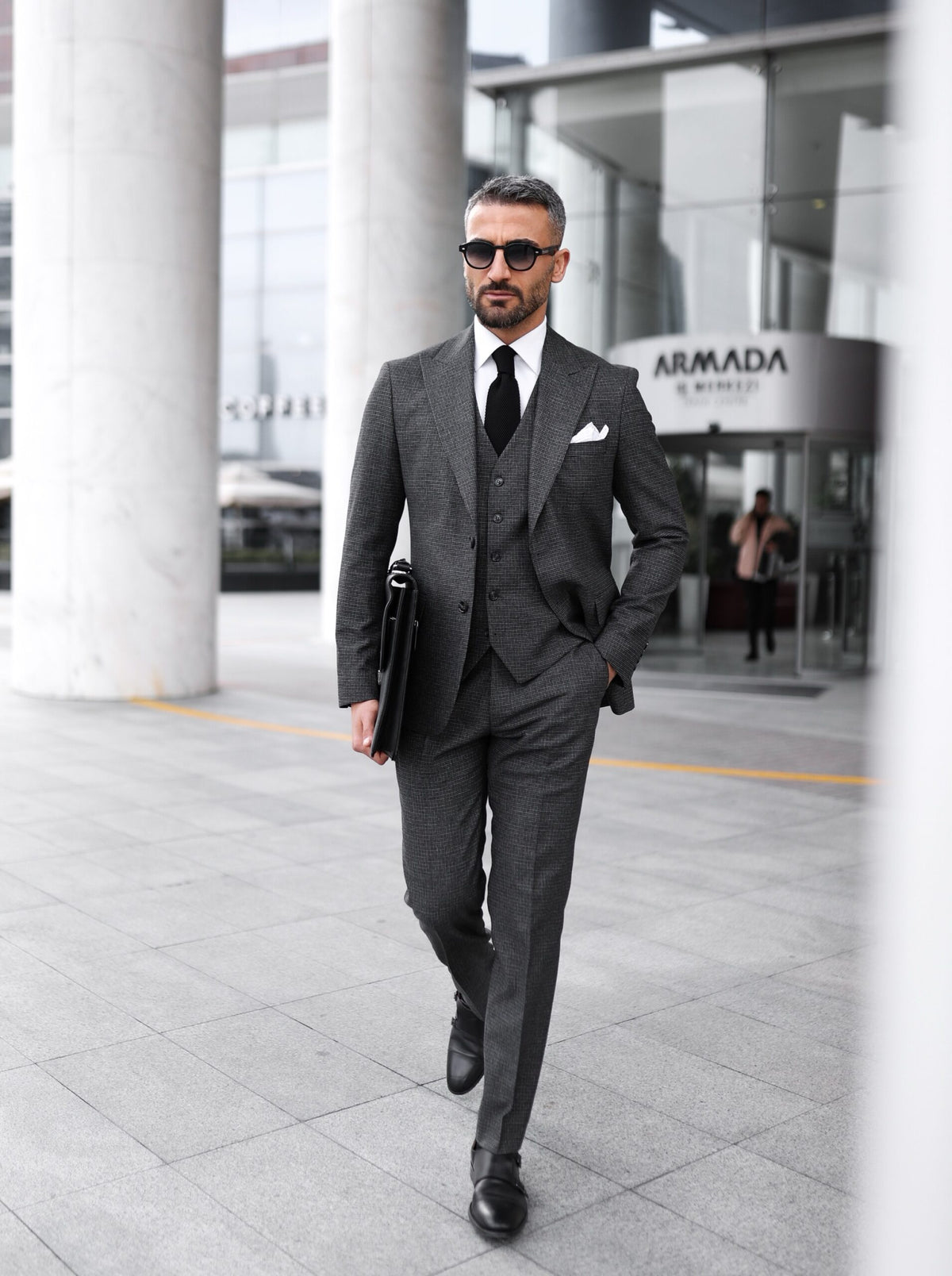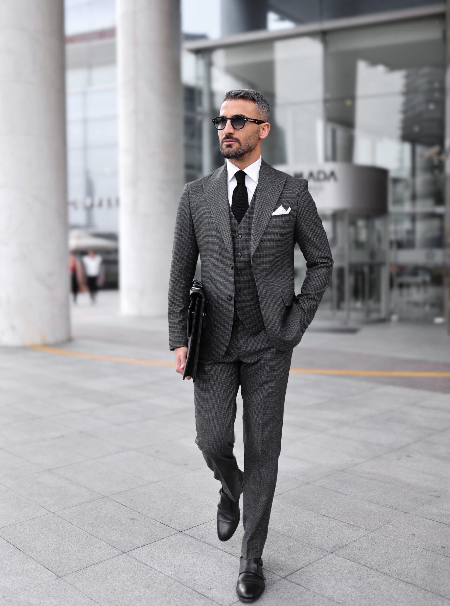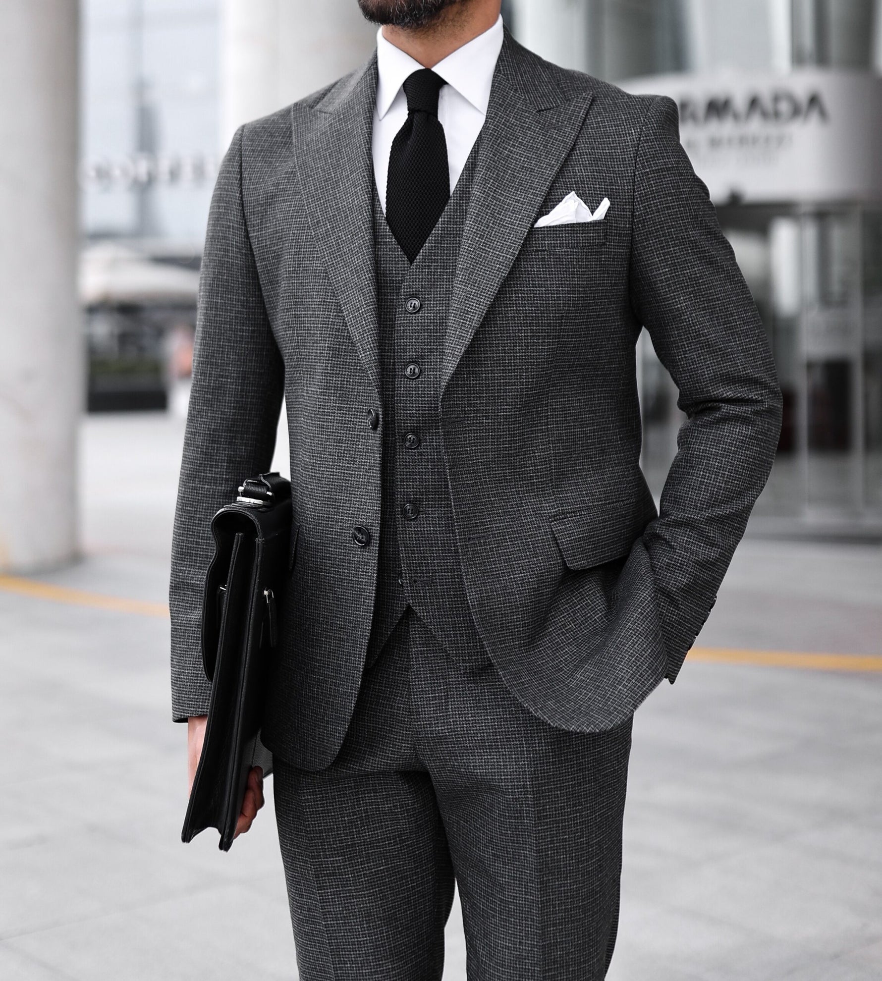 A grey checked three-piece suit made from a wool blend fabric is a stylish and sophisticated choice for formal or business attire. Wool is a popular choice for suits because it is a durable and high-quality fabric that is both warm and breathable. It is also resistant to wrinkling, making it a practical choice for everyday wear. A grey checked three-piece suit made from a wool blend would be a versatile and stylish choice that can be dressed up or down depending on the occasion and the accessories you choose to wear with it. It could be worn to a variety of events, from weddings and parties to business meetings and presentations.