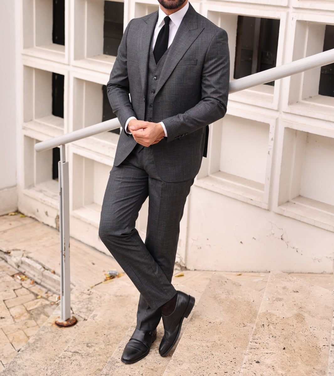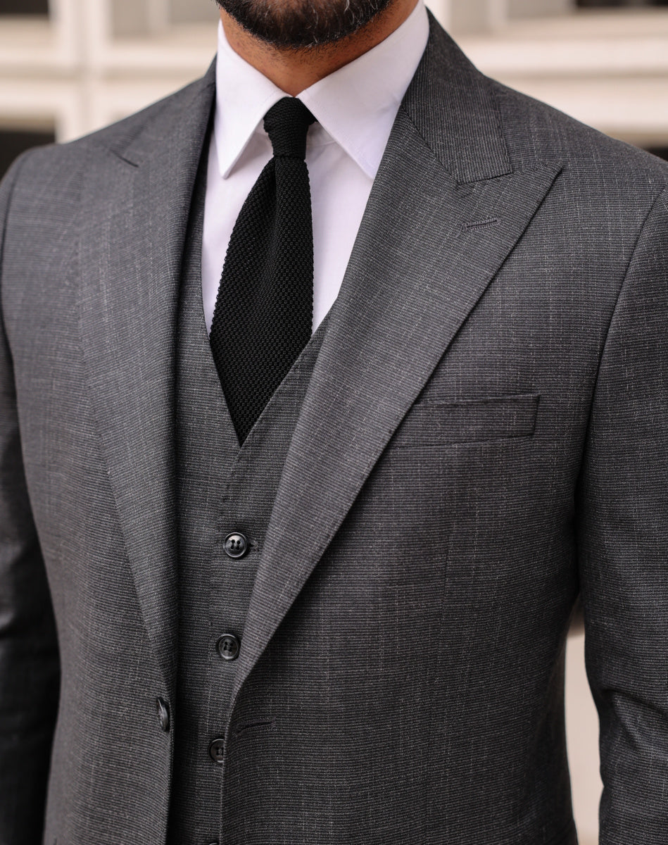 Slim fit grey men’s three piece suit with peak lapels