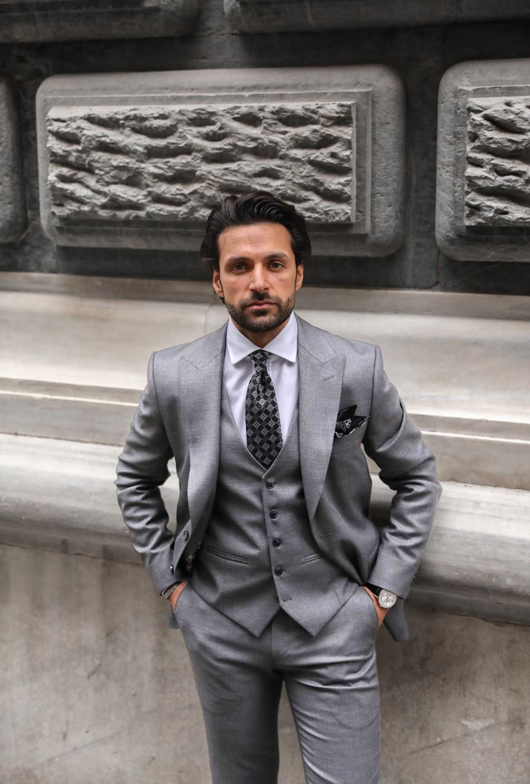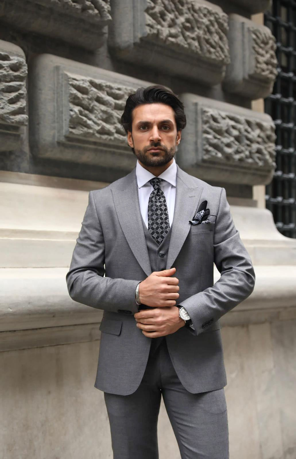 The single-breasted jacket features peak lapels, structured shoulders, and a two-button closure, exuding clean architectural lines and an understated sense of confidence. The five-button waistcoat adds depth and polish, while the flat-front trousers taper gracefully for a sharp, modern finish.