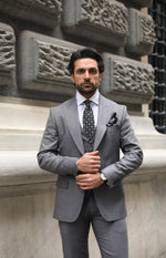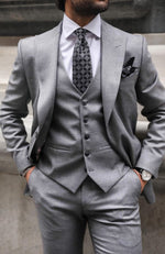The Warwick Retreat three piece suit is the embodiment of refined sophistication — a timeless design that celebrates the precision of British tailoring. Crafted from a light grey wool-blend fabric, it offers a sleek, contemporary silhouette that transitions effortlessly from daytime elegance to evening distinction.