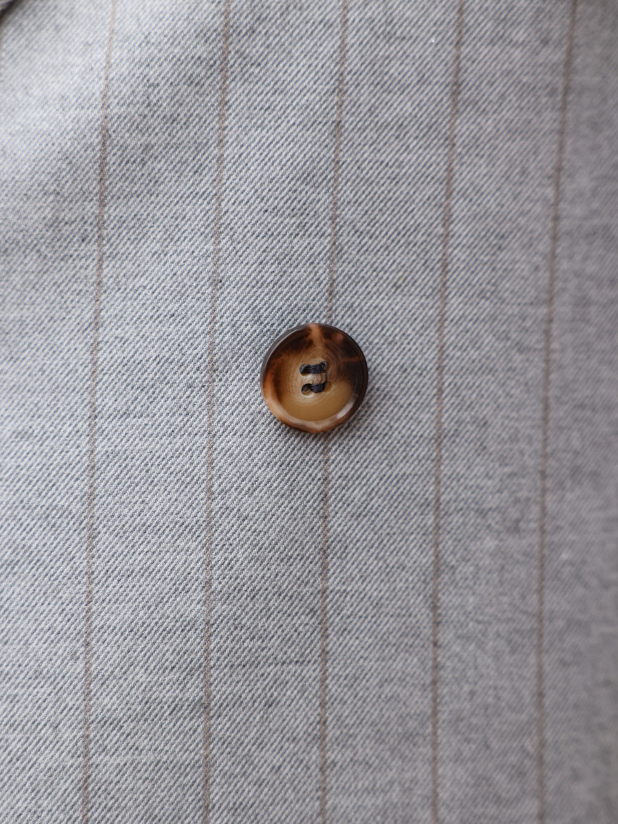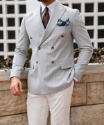 A tailored slim fit double breasted men’s suit in a mix of light grey double breasted pinstriped and white