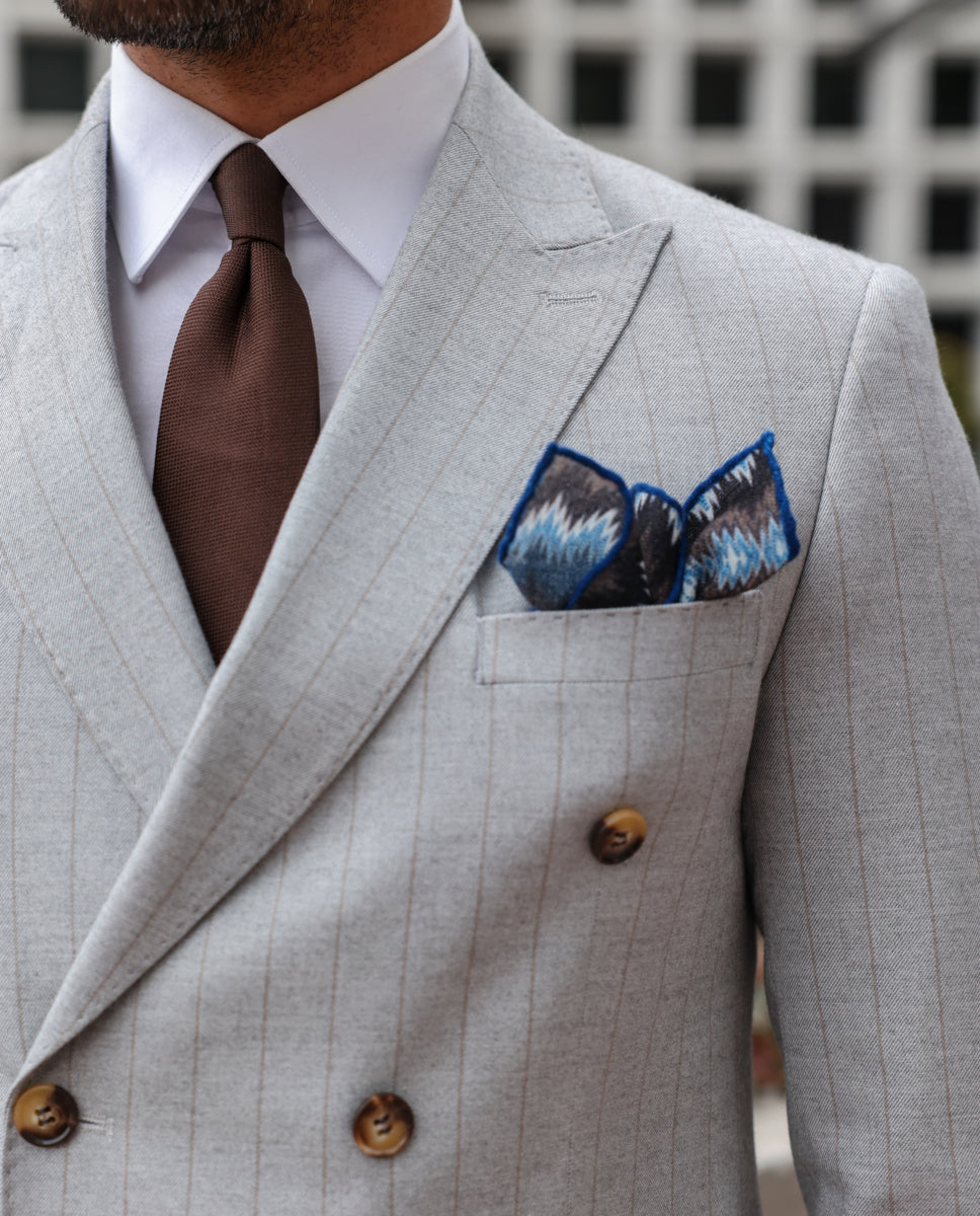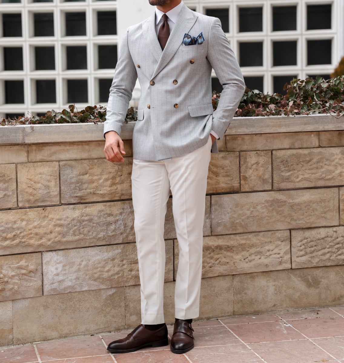 A tailored slim fit double breasted men’s suit in a mix of light grey double breasted pinstriped and white is a stylish choice for any formal occasion.The light grey colour is a warm, neutral shade that can be paired with a variety of dress shirts and ties. The pinstripes add a classic touch of visual interest to the suit. A double breasted suit has a more formal look, with overlapping front flaps and two rows of buttons. To complete the look, you could pair the suit with a white dress shirt, a pair of latte brown dress shoes, and a matching belt. You could also accessorize with a tie in a complementary colour, such as beige or cream. This outfit would be suitable for a variety of formal events, such as a wedding or a business conference