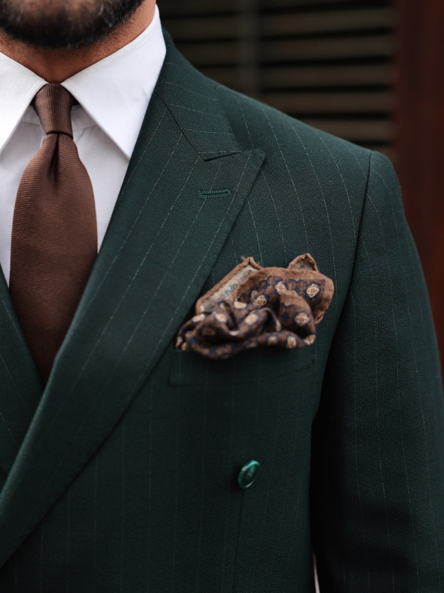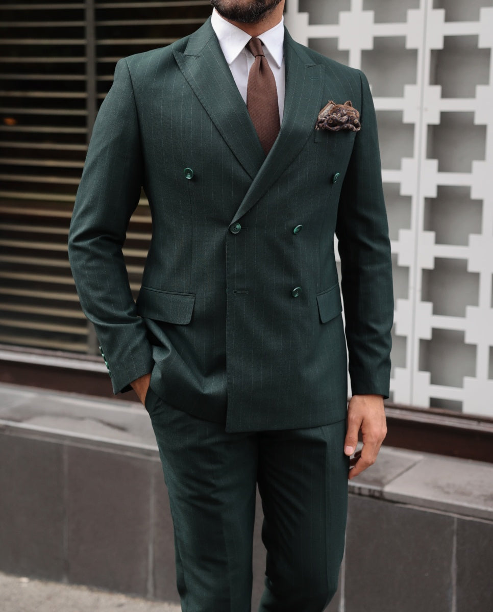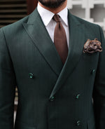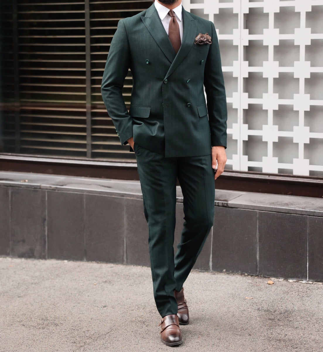 Tailored slim fit forest green double breasted pinstripe men's suit with peak lapels