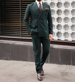 Elevate your style with a tailored slim fit forest green double-breasted pinstripe men’s suit. The pinstripe pattern adds a touch of sophistication to the rich forest green hue, creating a harmonious blend of modern and classic. The peak lapels enhance its timeless appeal, making it ideal for formal events. This ensemble exudes confidence and refinement, allowing you to stand out with a distinctive and sophisticated look. Whether for upscale gatherings or special occasions, this suit showcases your impeccable taste and individuality.