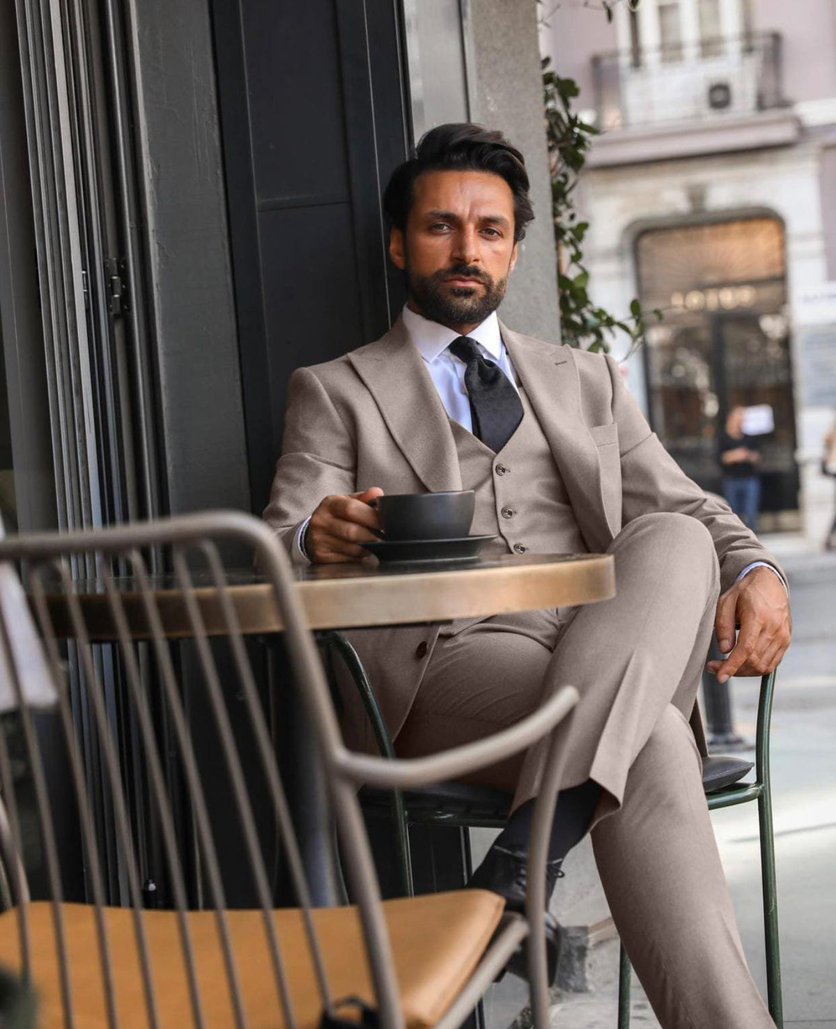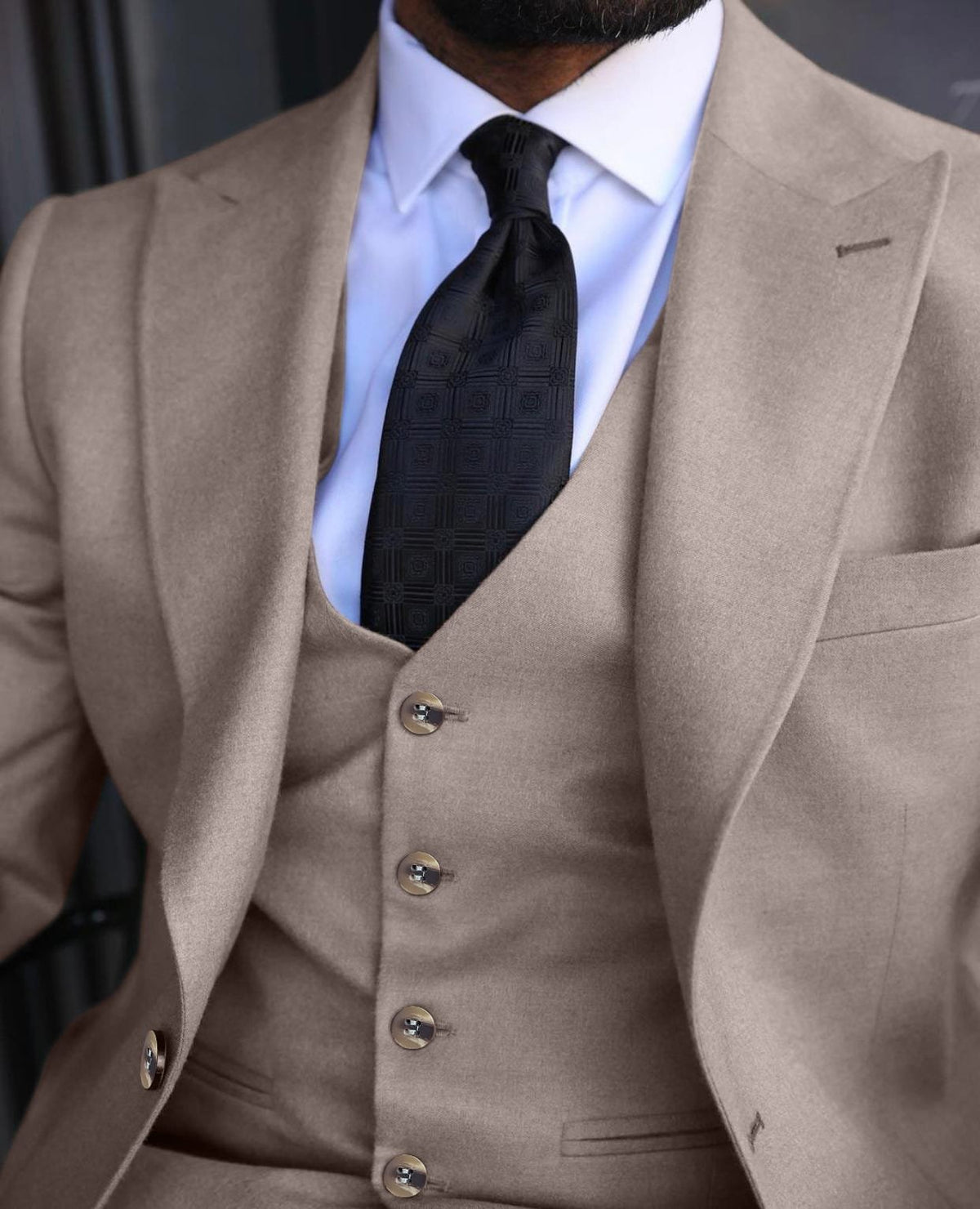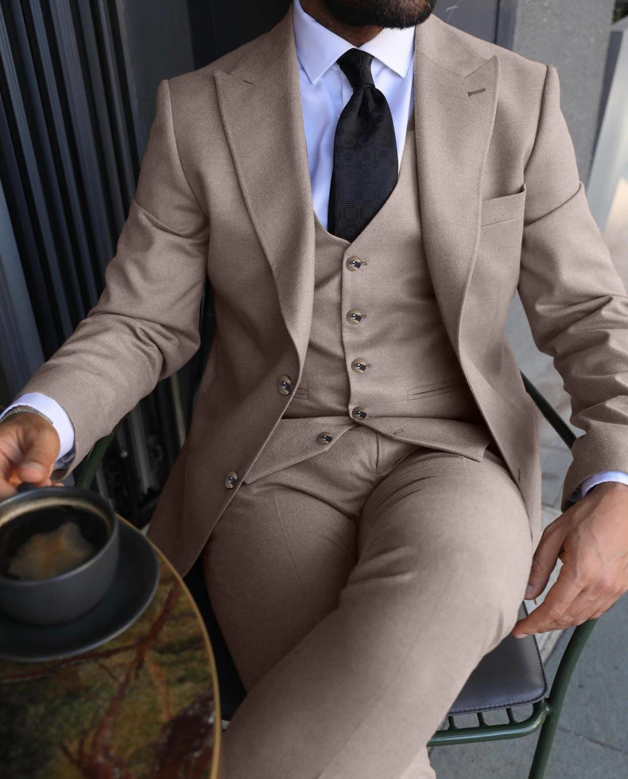 The slim fit cream three-piece suit with peak lapels is a sophisticated and elegant ensemble that is perfect for any formal occasion. The cream colour adds a touch of classic refinement, while the slim fit cut of the suit creates a modern and sleek silhouette. The peak lapels add a timeless touch of sophistication, making the suit suitable for any formal event. The suit includes a jacket, waistcoat, and trousers, all designed to provide both style and comfort. The trousers feature a flat front and two side pockets, adding a practical touch to the ensemble. This versatile and high-quality suit is perfect for anyone who wants to make a stylish statement at any formal event, whether it be a wedding, business meeting or any other special occasion.