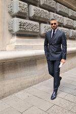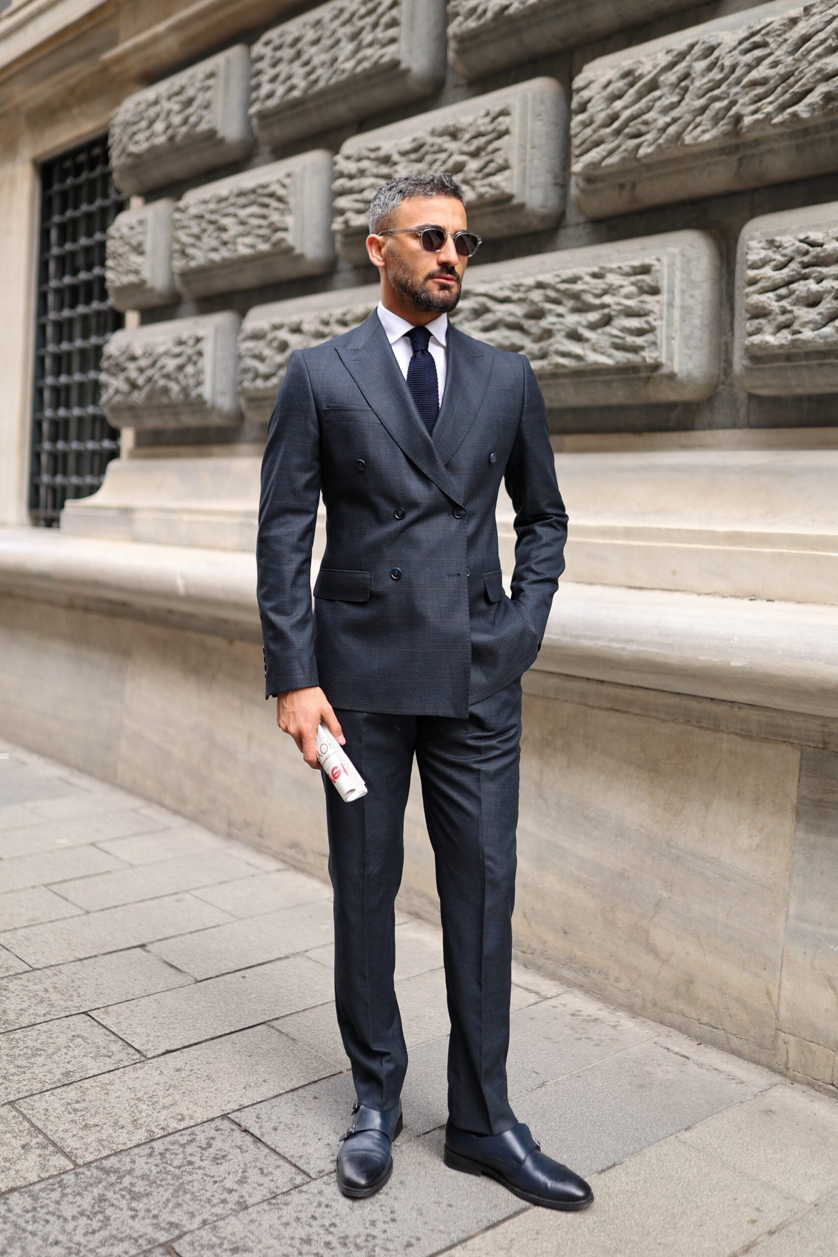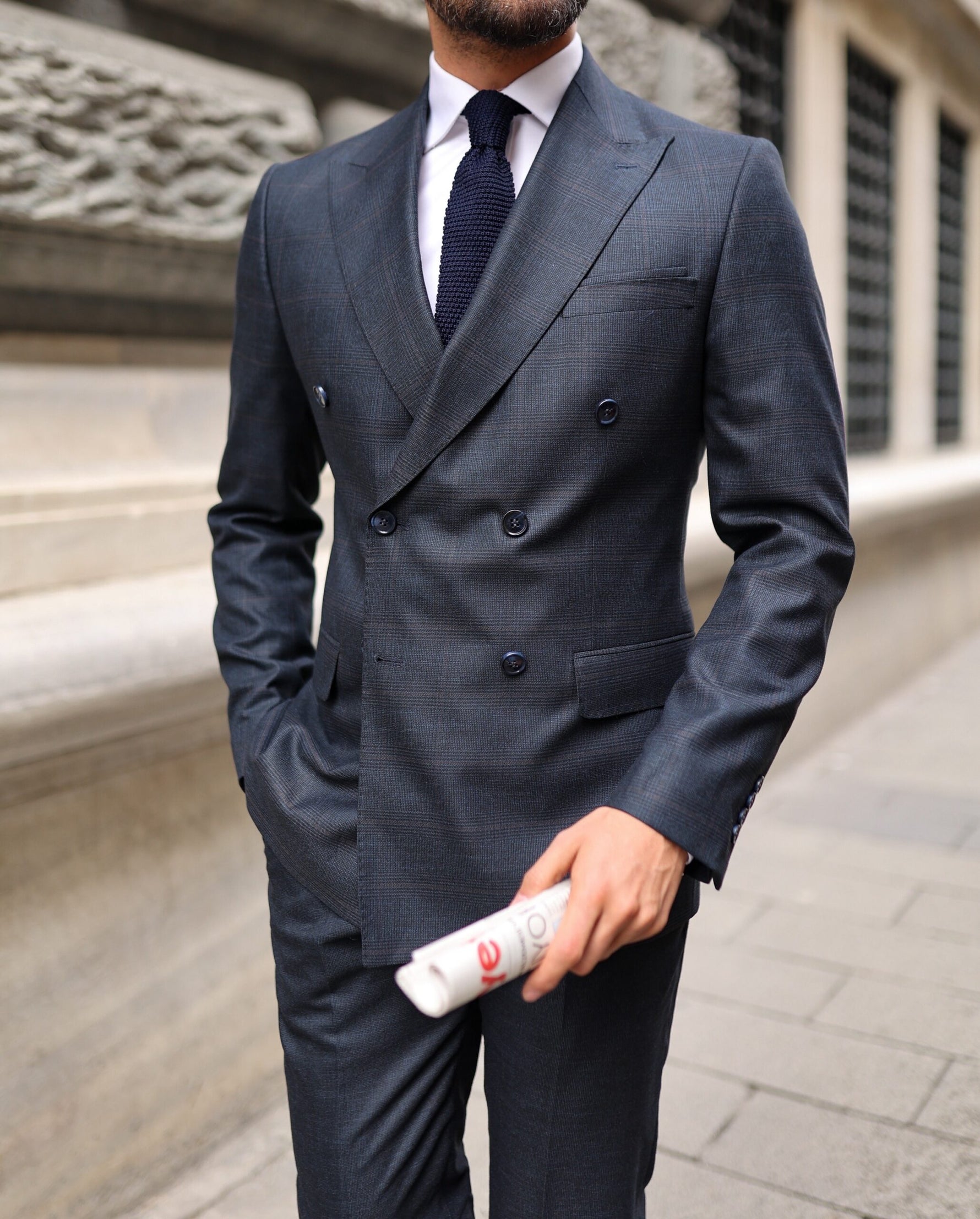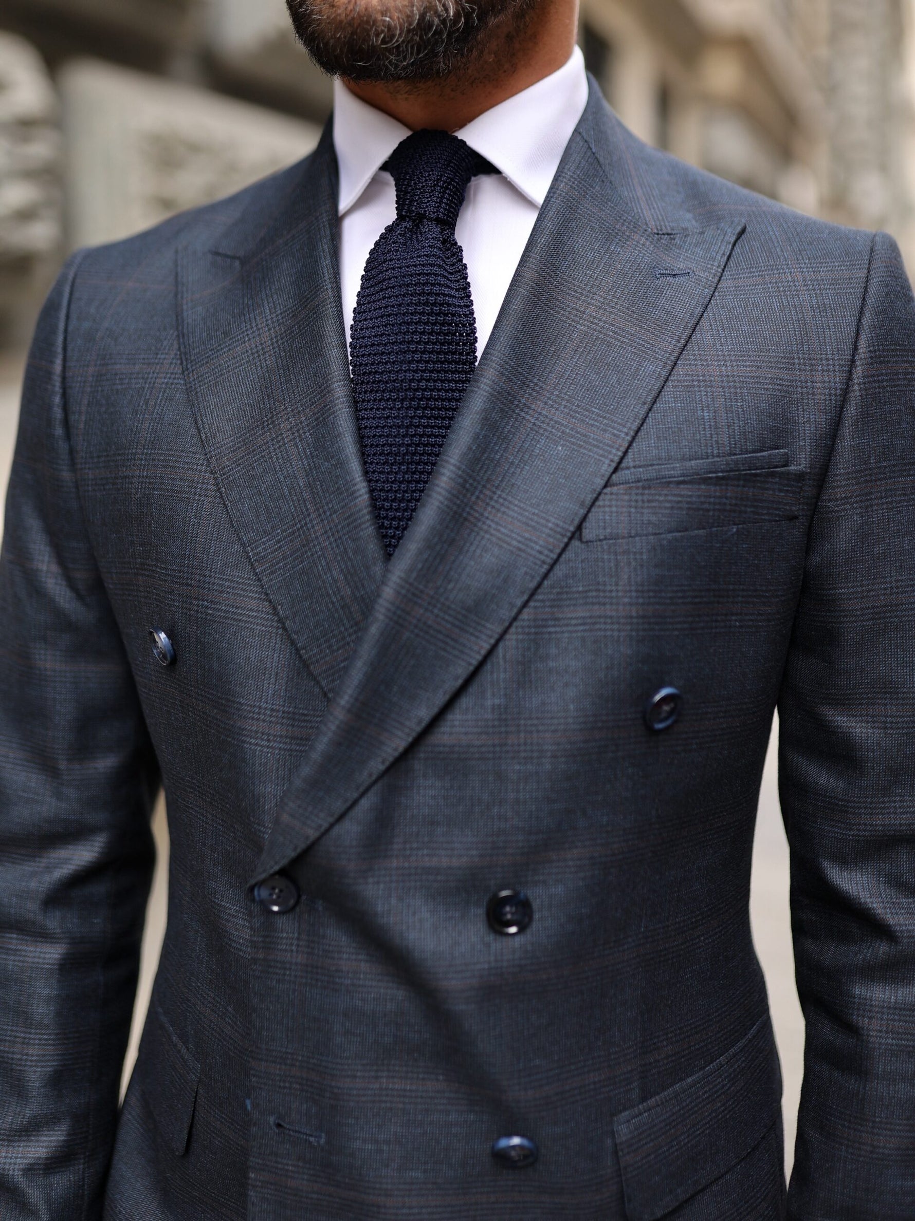 A dark blue checked with brown fine lines double breasted suit can be a stylish and sophisticated choice for a variety of occasions. The double breasted style of the suit jacket, which features overlapping front panels that fasten with two rows of buttons, is a classic and formal look that is suitable for events such as weddings, business meetings, and formal parties. The dark blue colour is a timeless and classic choice that pairs well with a variety of shirt and tie combinations. The checked pattern adds a touch of visual interest to the outfit. For a formal event, you could pair the suit with a crisp white shirt and a coordinating tie in a complementary colour, such as silver or black. For a more casual look, you could pair it with a sweater or a patterned shirt and skip the tie. Accessorizing with a pocket square, lapel pin, or cufflinks can also add a touch of personal style to the outfit.