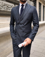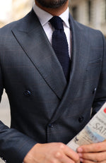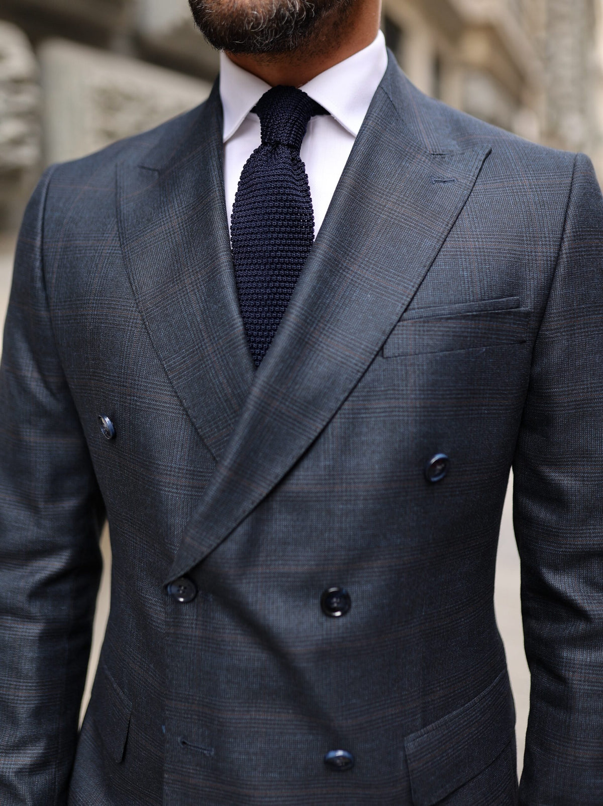Slim fit dark blue checked with brown fine lines double breasted men’s suit with peak lapels