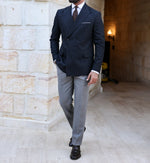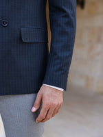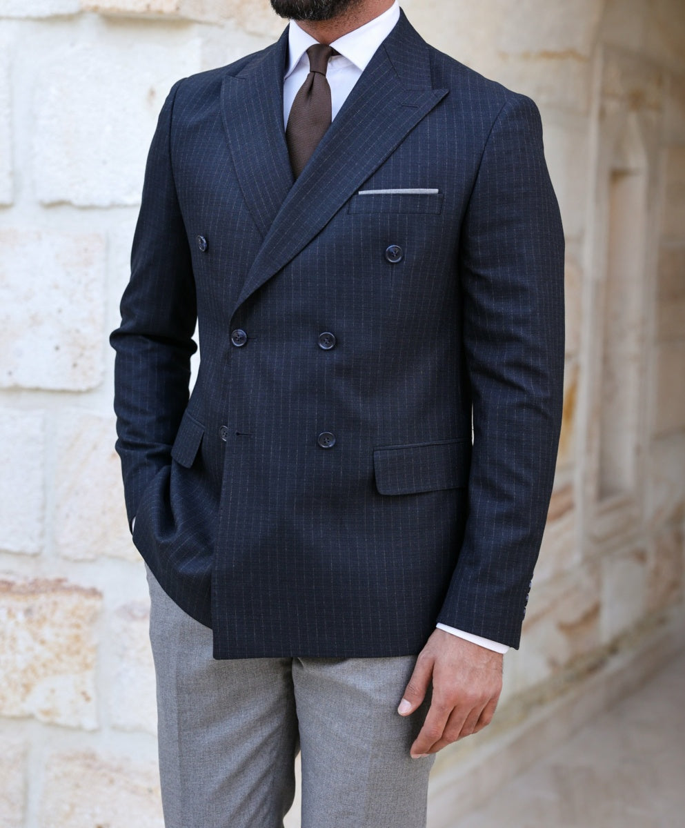 Slim fit double breasted dark blue pinstriped with grey trousers men’s suit with peak lapels