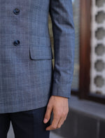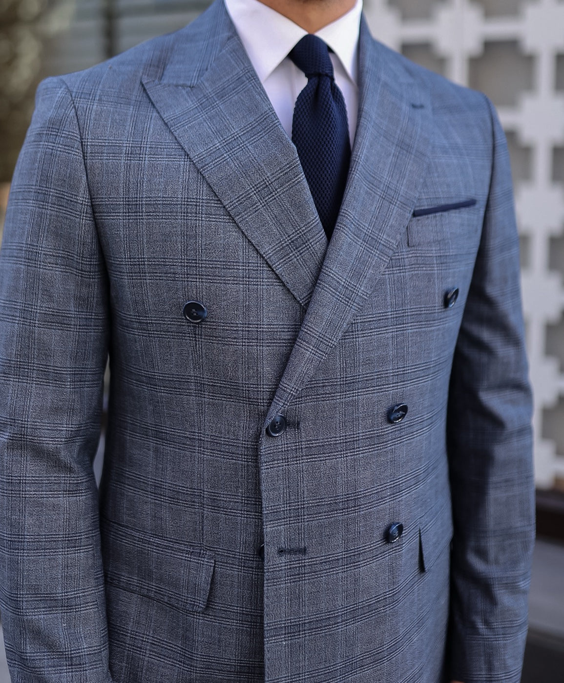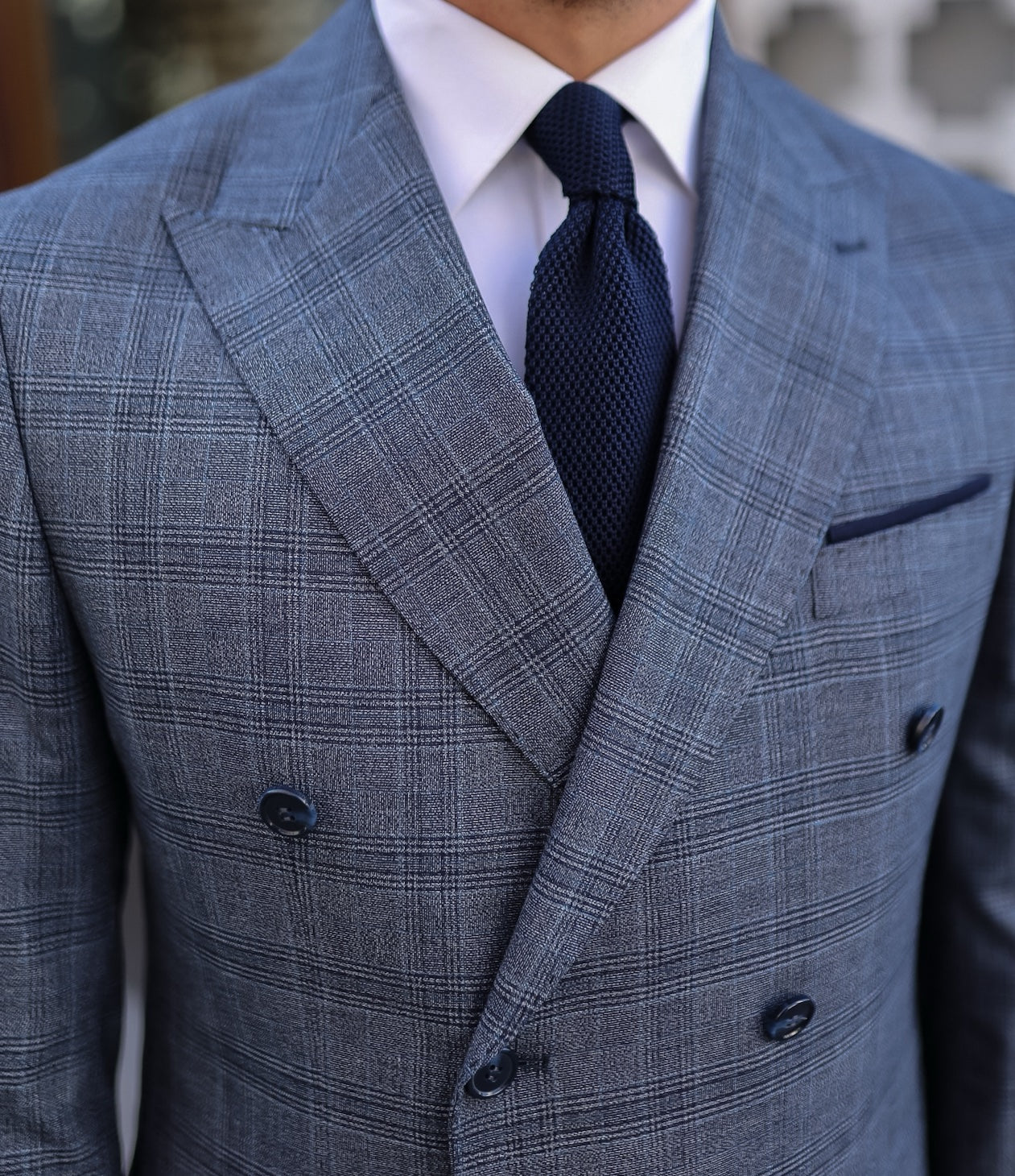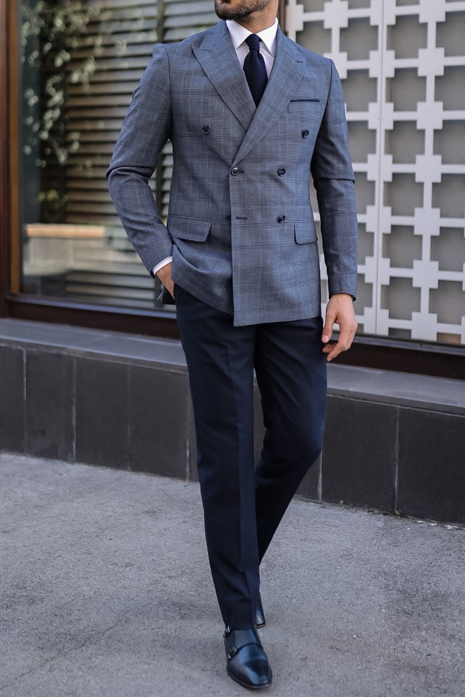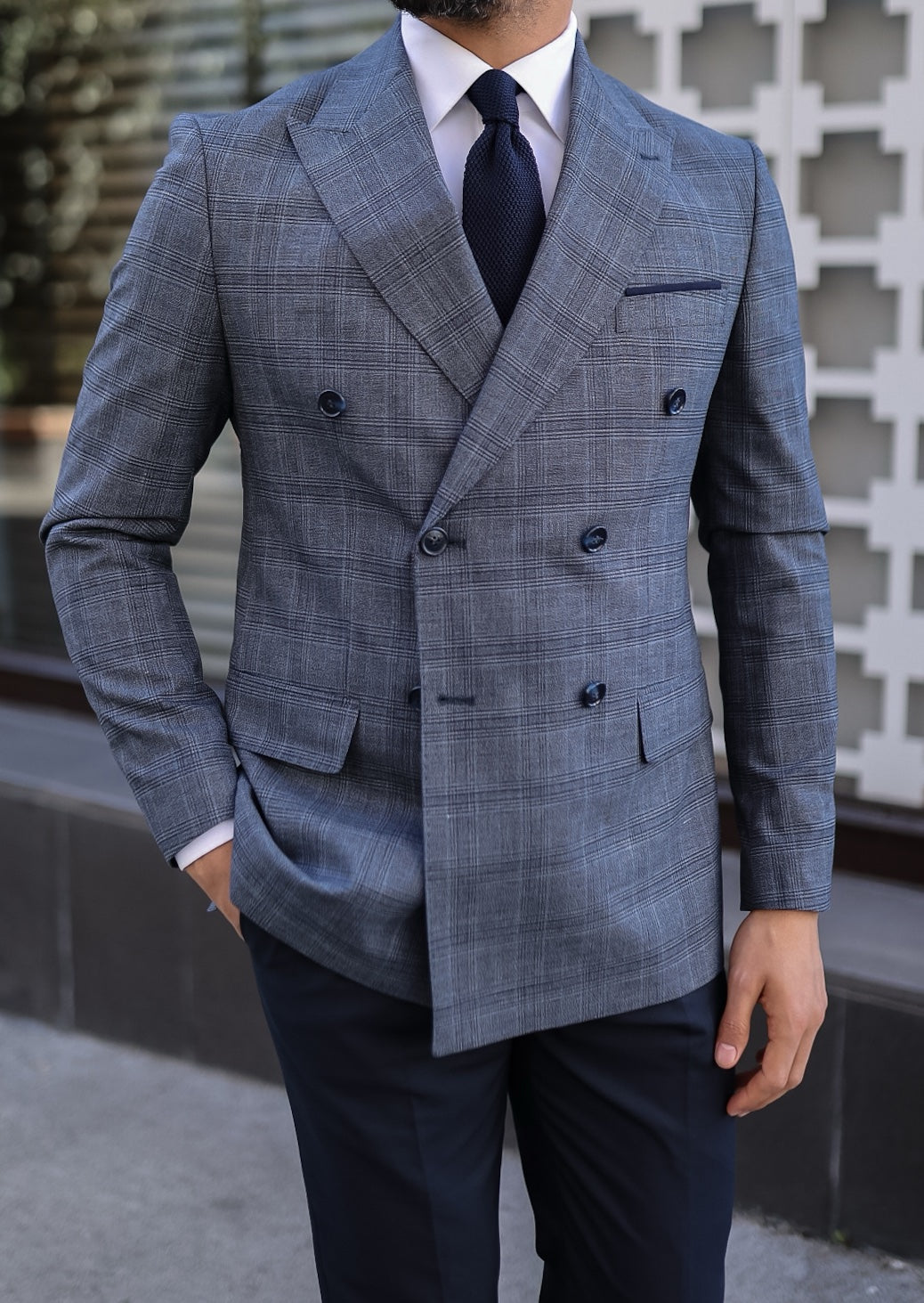 A  navy blue checked double breasted blazer with plain navy trousers is a stylish and sophisticated outfit that is perfect for a variety of occasions. The navy blue colour is a deep, muted shade that is both classic and contemporary, and pairs well with a variety of other colours.