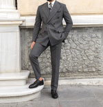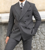 Slim fit light grey pinstriped double breasted two piece men’s suit with peak lapels