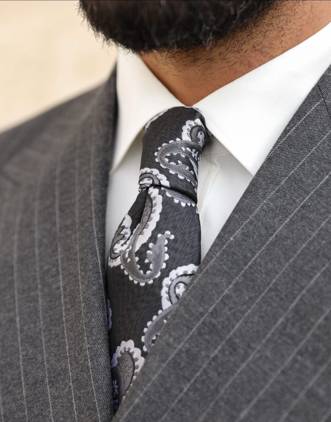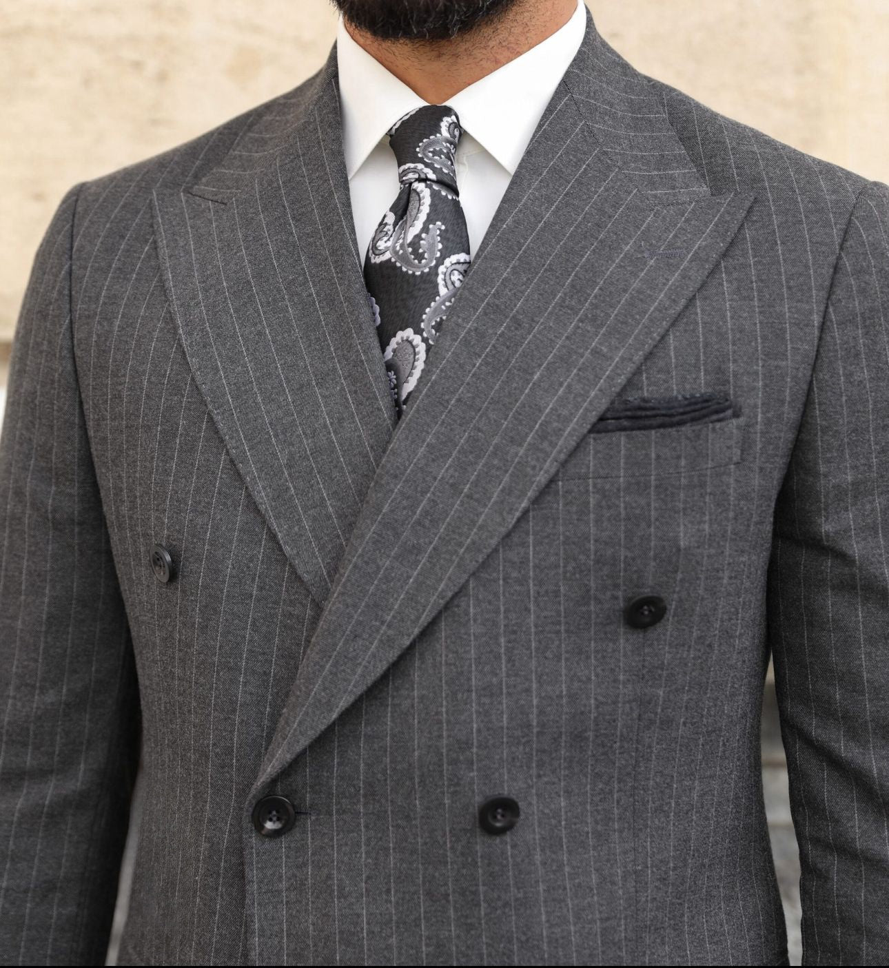 A grey pinstriped double breasted two piece suit is a classic and stylish choice for formal and semi-formal occasions. Pinstripes are thin, vertical stripes that add a formal touch to a suit. Double breasted suits have a wide overlap of the front panels and usually have six or eight buttons. They tend to be more formal and are a good choice for events where you want to make a strong impression.