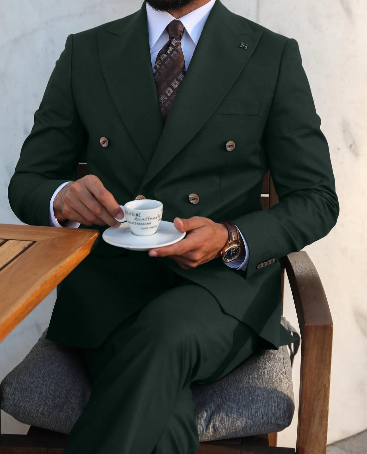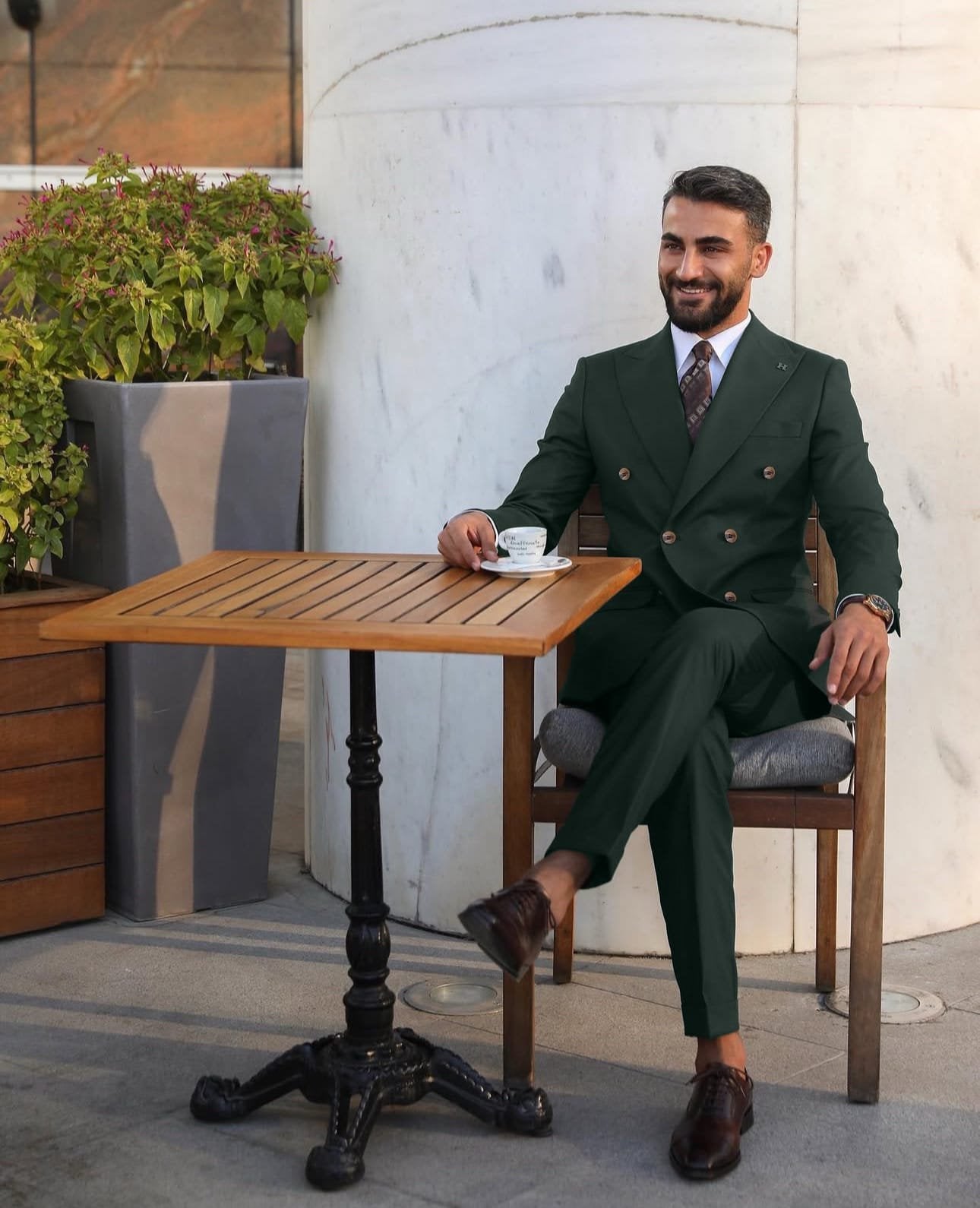 The tailored slim fit emerald green double-breasted men’s suit is a bold statement of style. The striking emerald green hue commands attention and adds a unique touch to any occasion. The slim fit design ensures a modern and flattering silhouette. With its double-breasted construction, this suit exudes confidence and elegance, making it a standout choice for those who dare to make a fashion-forward statement.