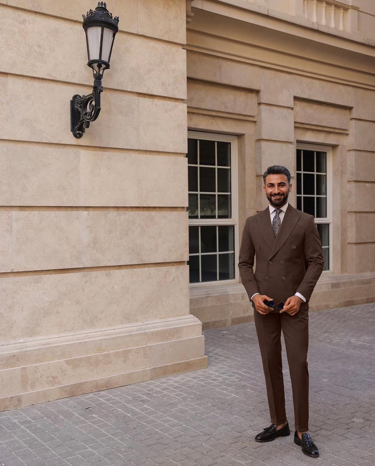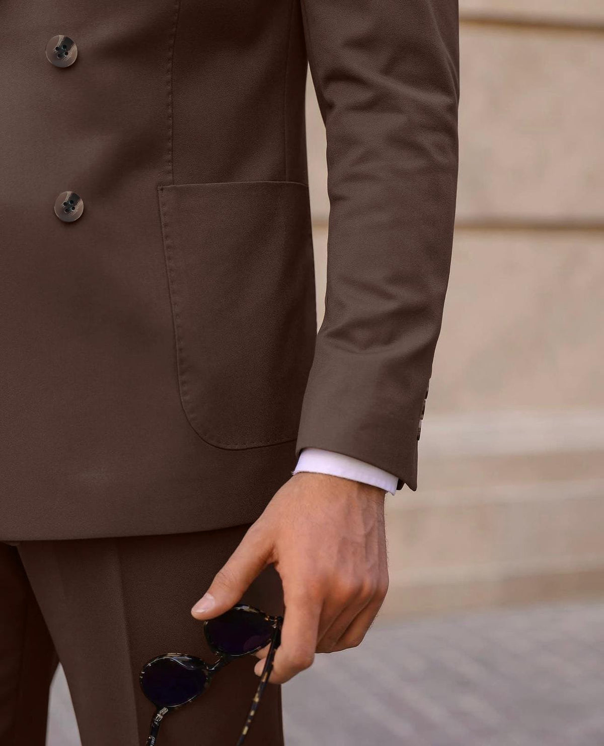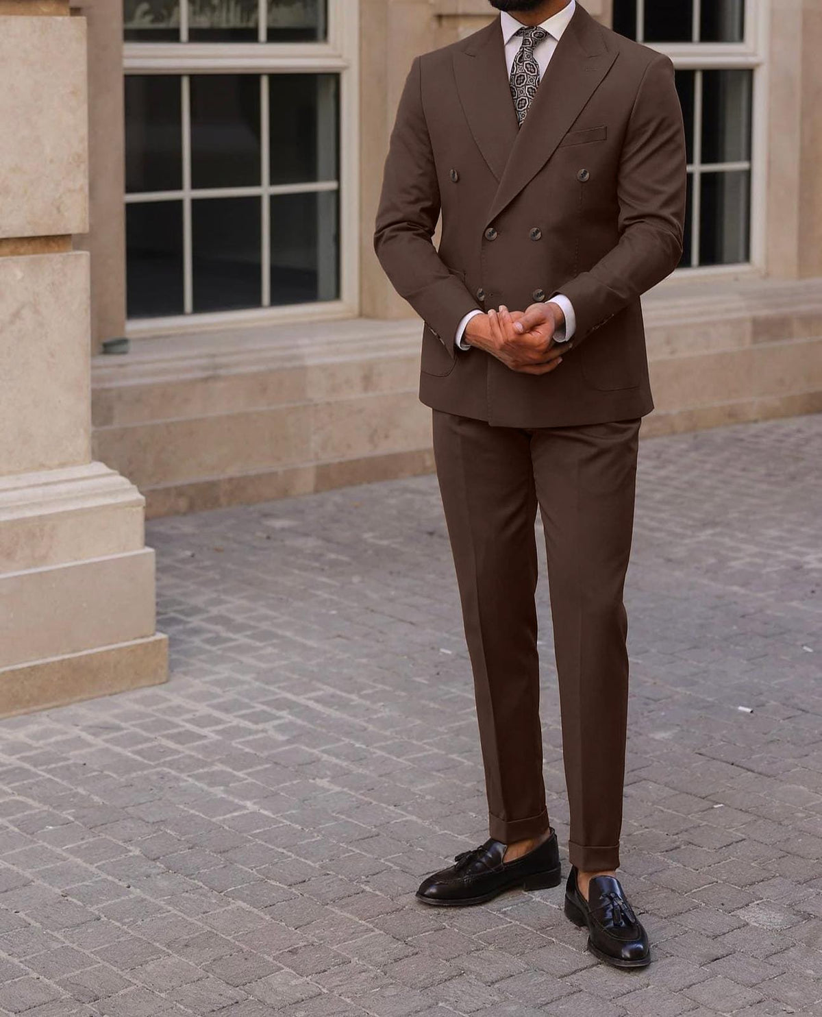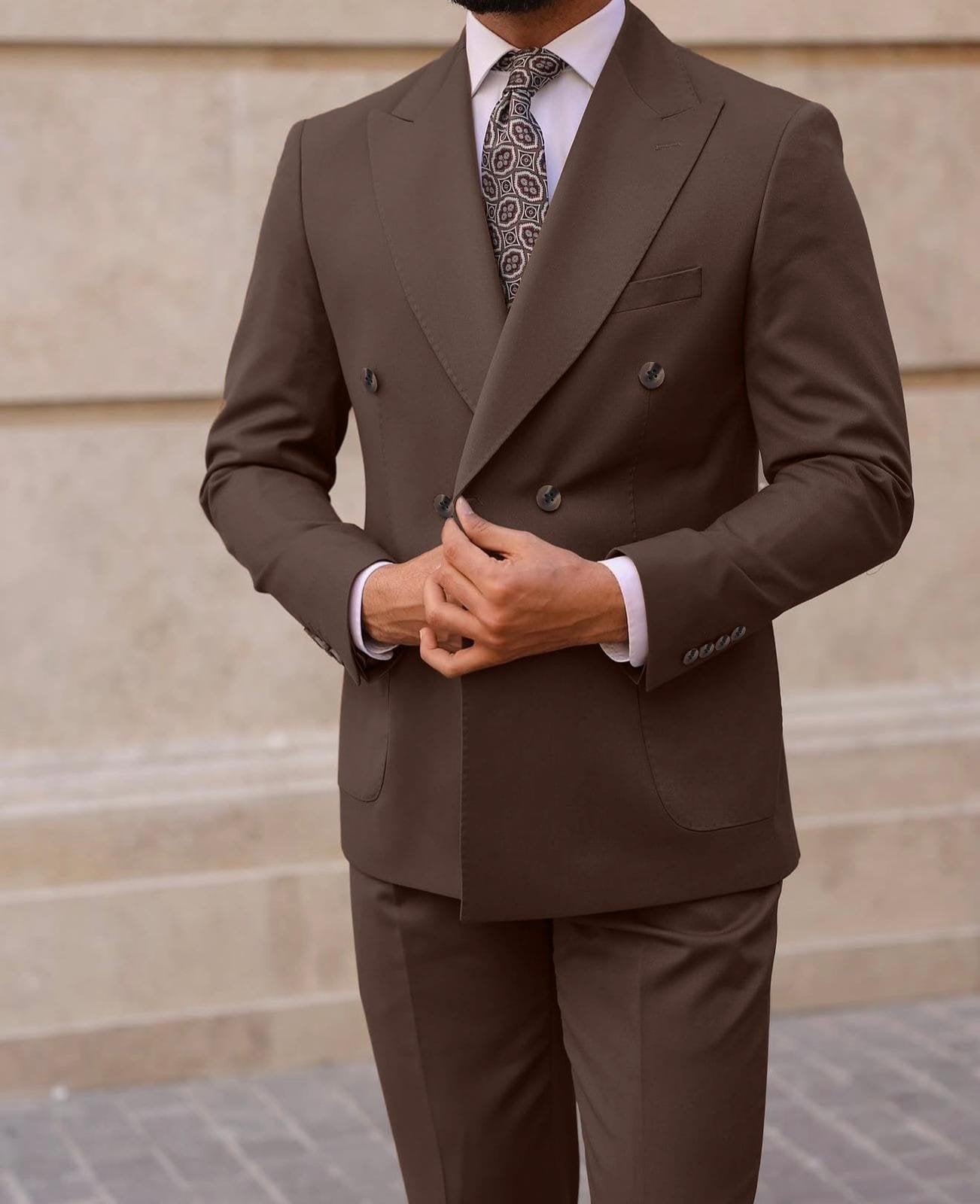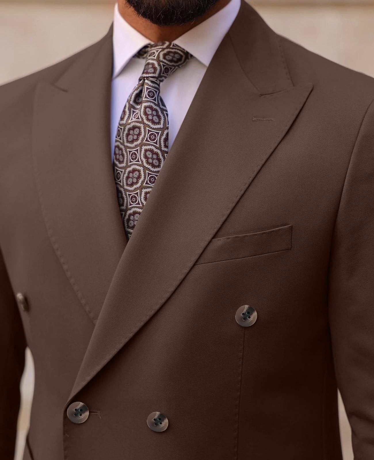 A brown double breasted suit in a slim fit can be a stylish and sophisticated choice for formal occasions or business meetings. The brown colour and slim fit give the suit a modern, tailored look, and the double breasted style adds a touch of formality.
