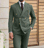 Step into refined elegance with a tailored slim fit olive green double-breasted men’s suit. The alluring olive green hue adds a unique twist to traditional suiting, while the double-breasted design and peak lapels exude sophistication. Perfect for upscale events or formal occasions, this suit effortlessly blends modern aesthetics with classic charm. Its precise tailoring ensures a sleek silhouette that flatters your physique. The structured jacket, adorned with peak lapels, complements the streamlined trousers for a balanced ensemble. Embrace the versatility of olive green, allowing you to create various shirt and tie combinations. Make a memorable impression with this meticulously crafted men’s suit, showcasing your distinct style.