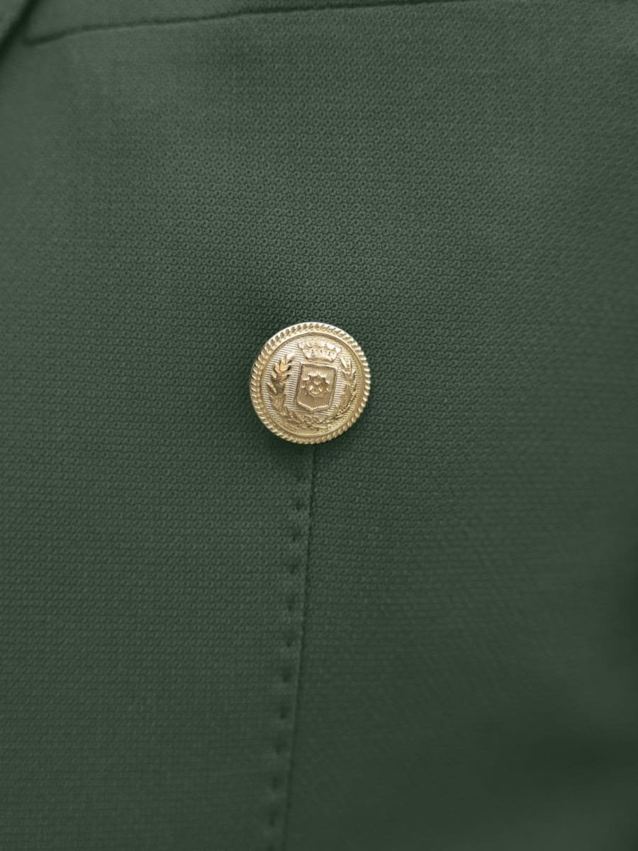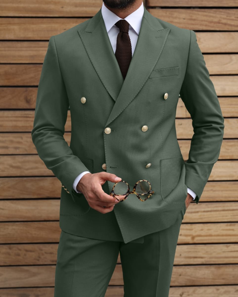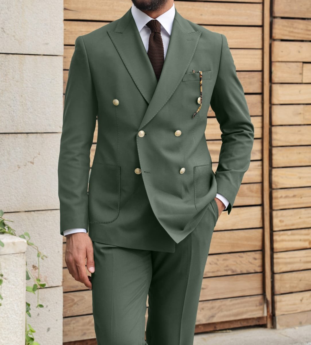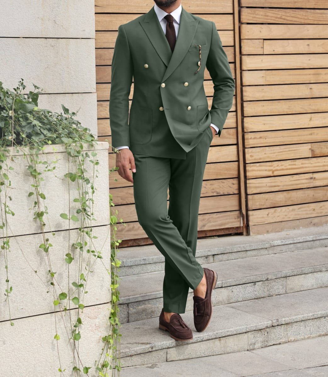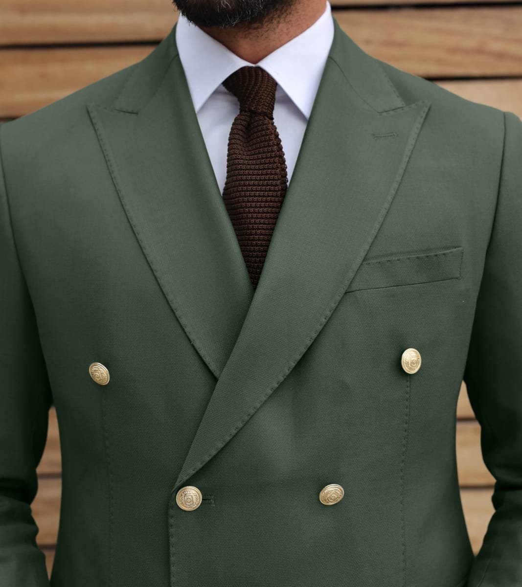 Tailored slim fit olive green double breasted men’s suit with peak lapels