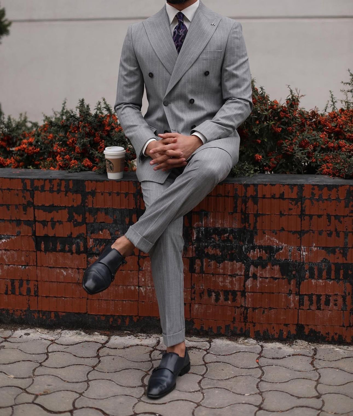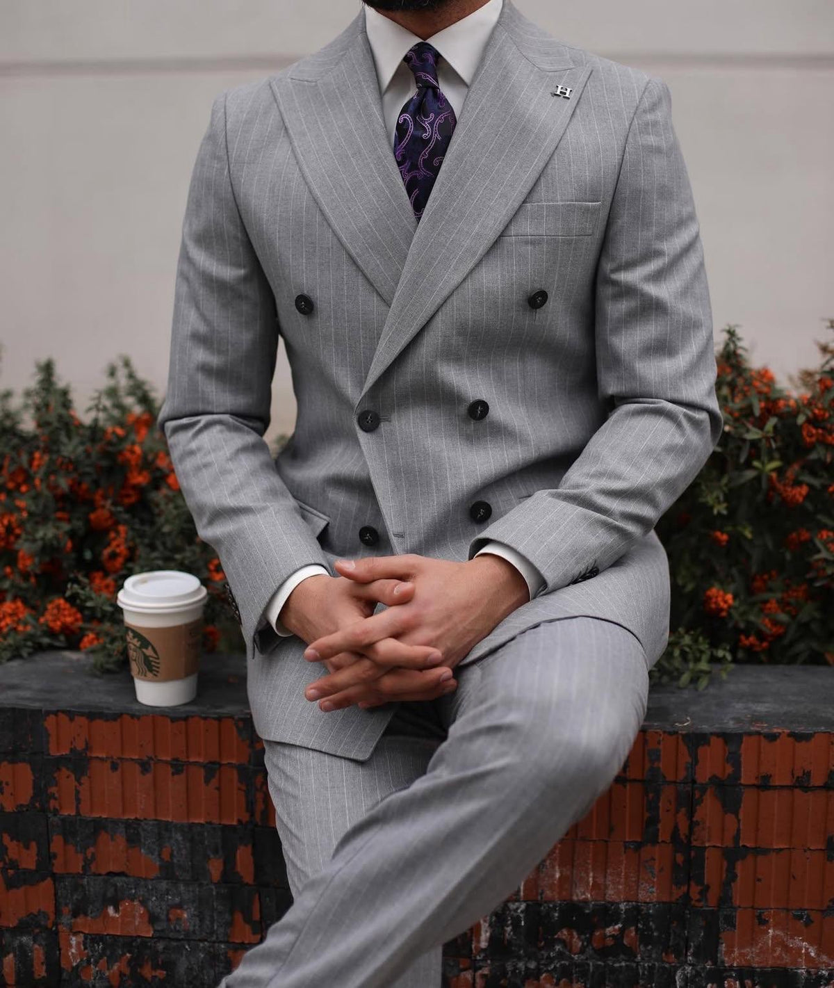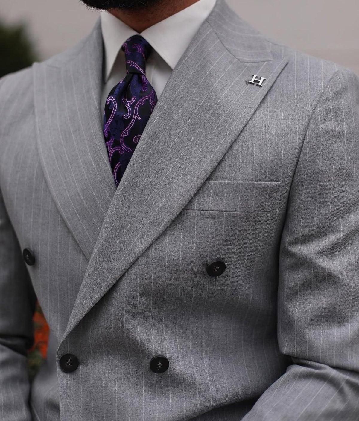 A grey pinstriped double breasted suit can be a stylish and sophisticated choice for formal occasions or business events. The grey colour is a versatile and neutral shade that can be paired with a variety of dress shirts and ties. The pinstripes add a classic touch of visual interest to the suit. A double breasted suit has a more formal look, with overlapping front flaps and two rows of buttons.