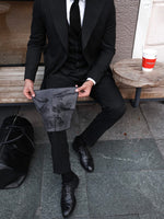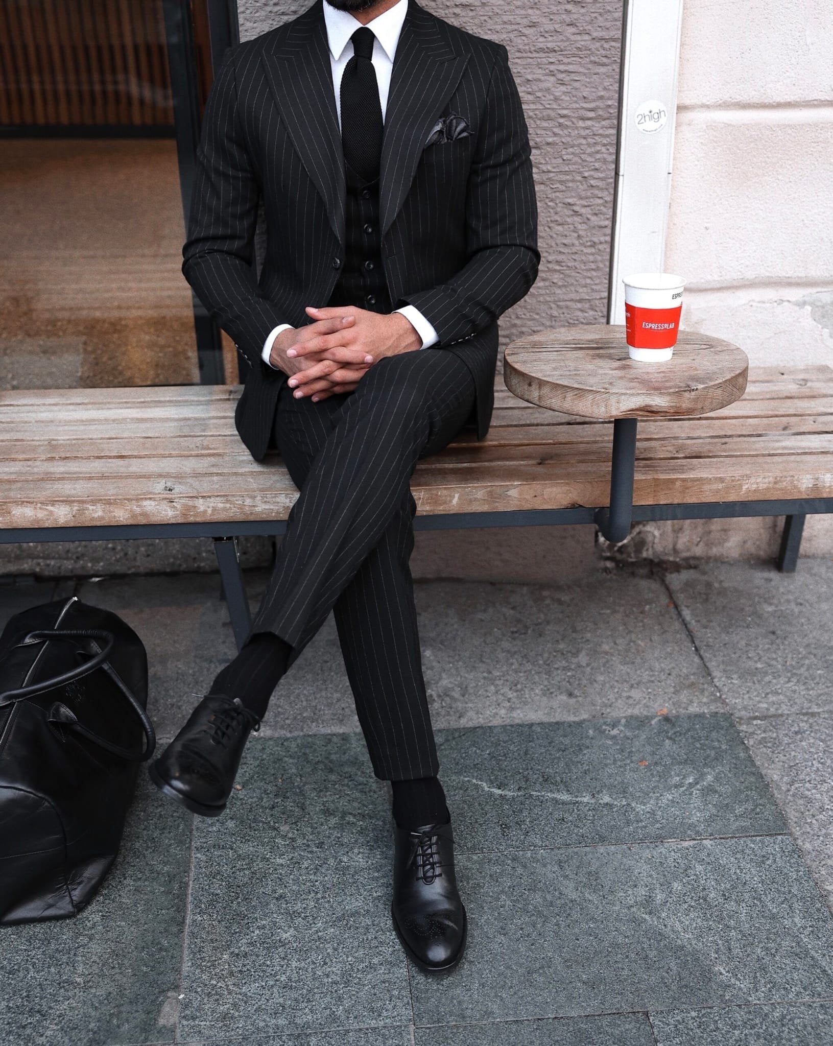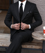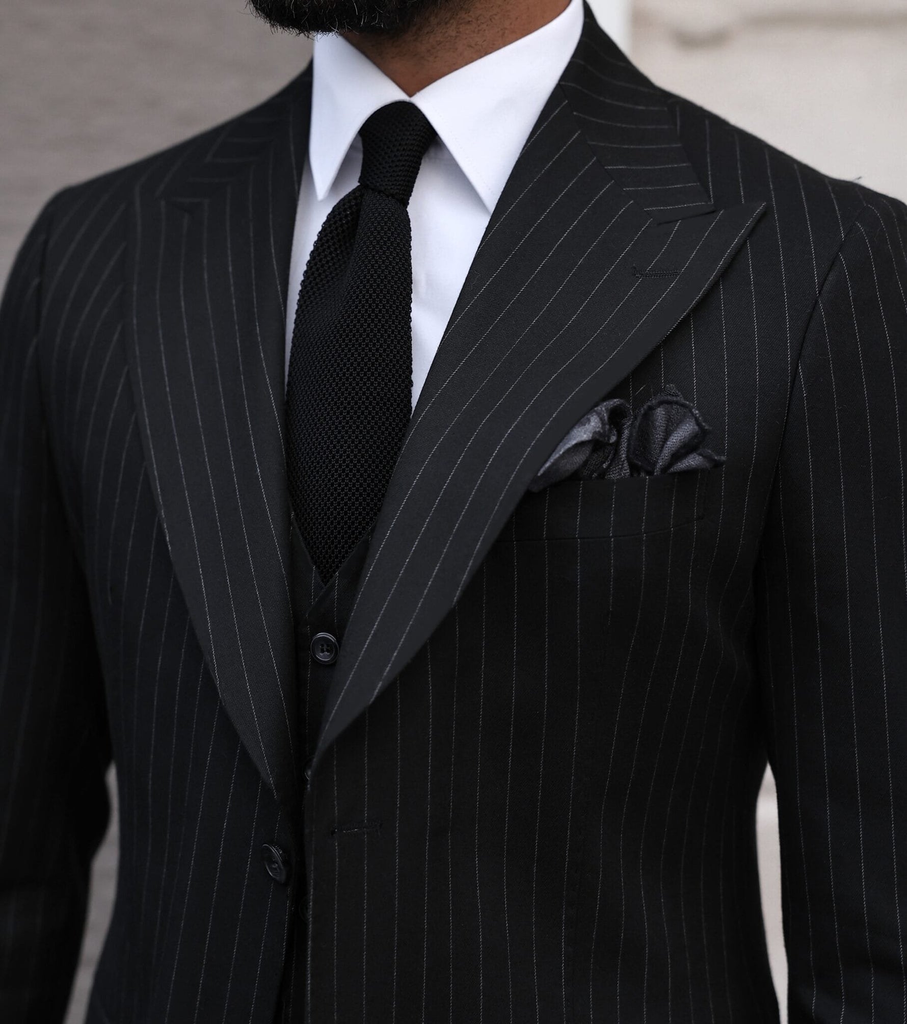 Slim fit all black pinstripe three piece men’s suit with peak lapels