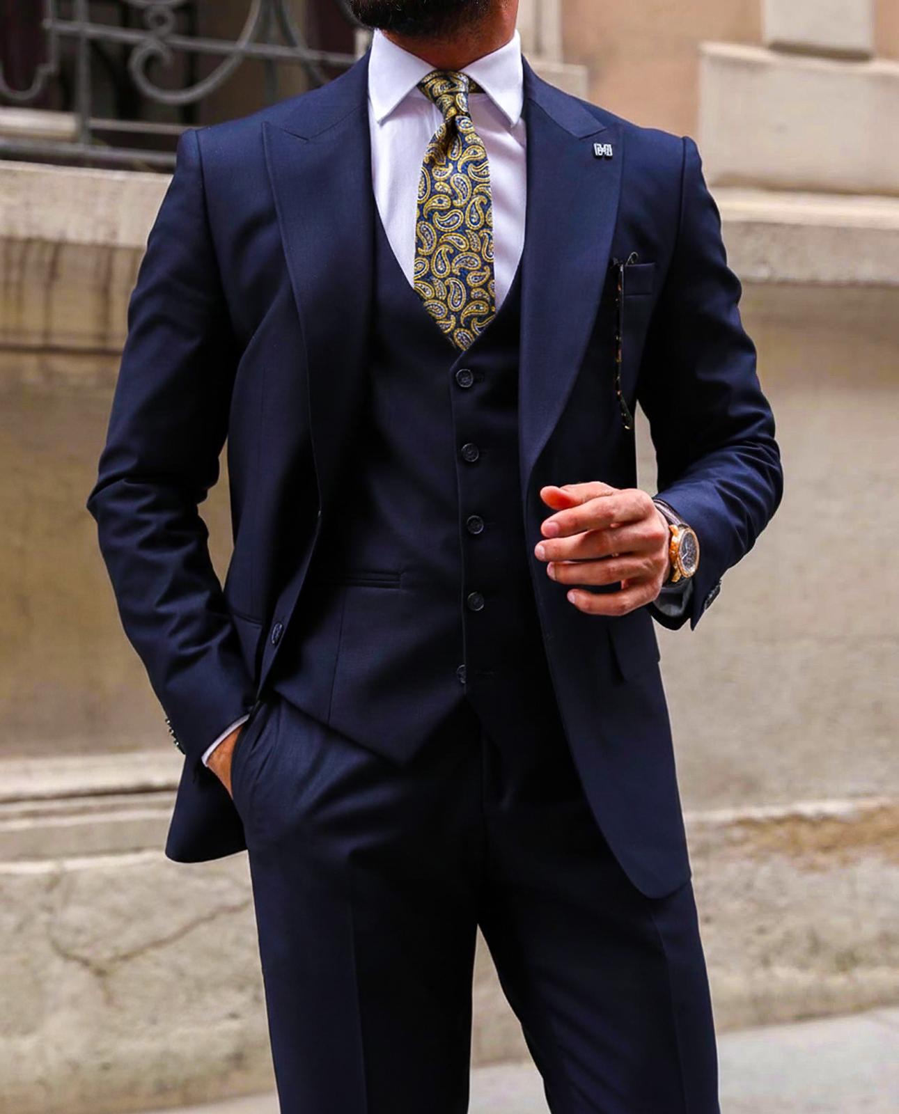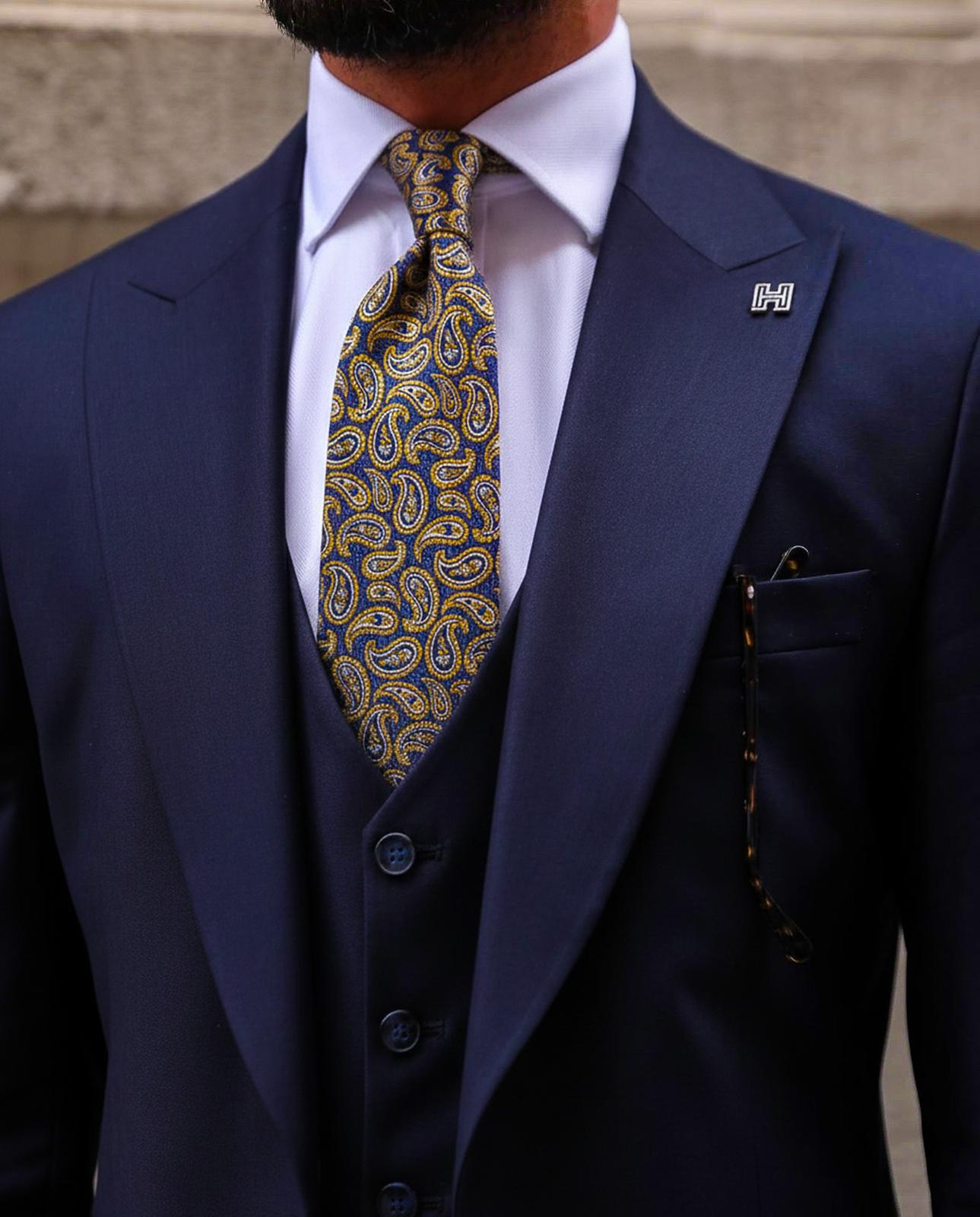A timeless statement piece, this navy and gold paisley tie brings heritage elegance to modern tailoring. Featuring an intricate paisley design woven in warm gold tones against a deep navy base, it delivers refined contrast with a luxurious finish.