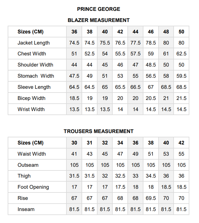Please note, sizes may vary slightly depending on the material and stretch however with many items additional material is left in the waistband of the trousers which allows for expansion or reduction. The bow tie is not included in the suit at the moment.