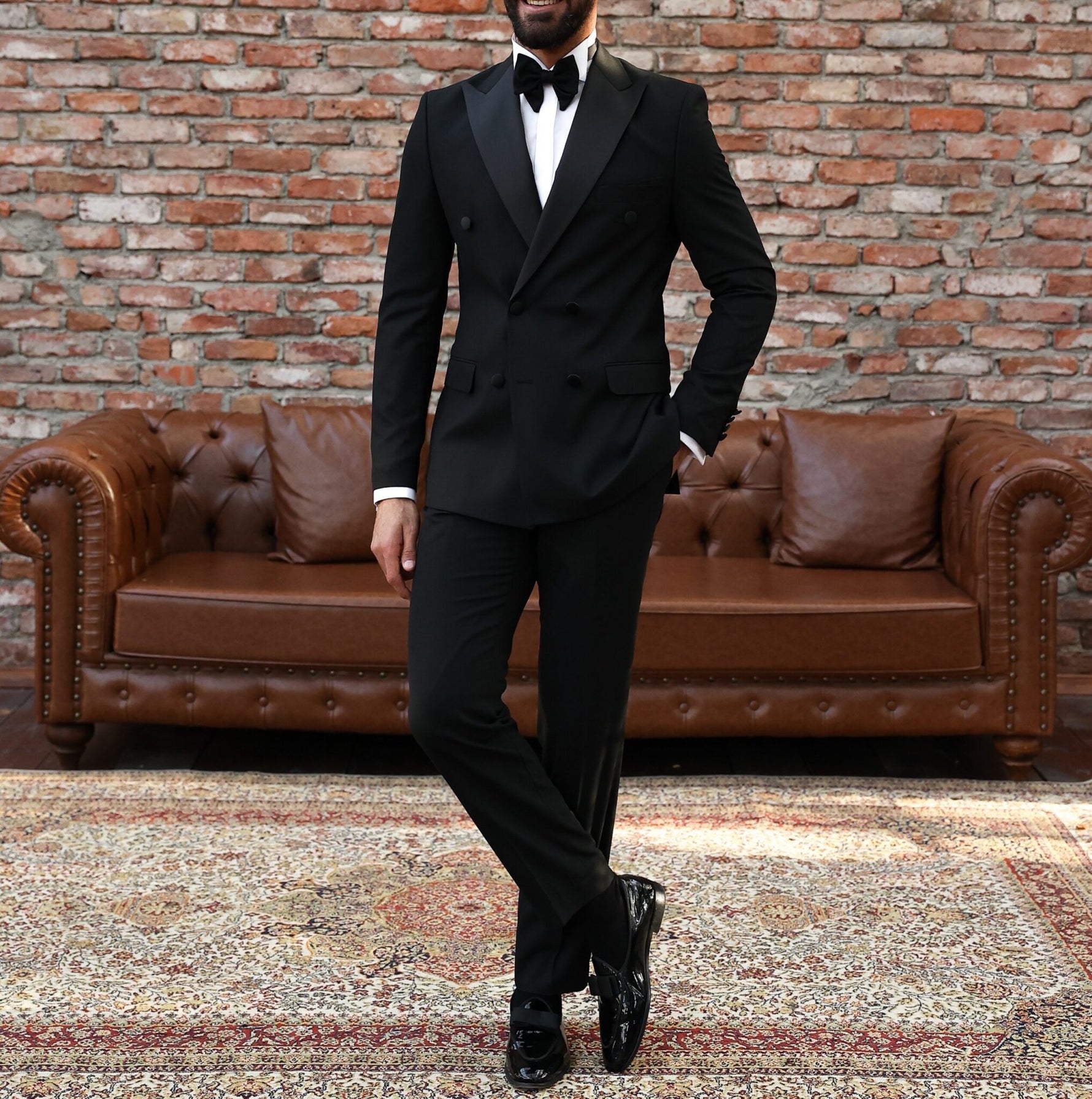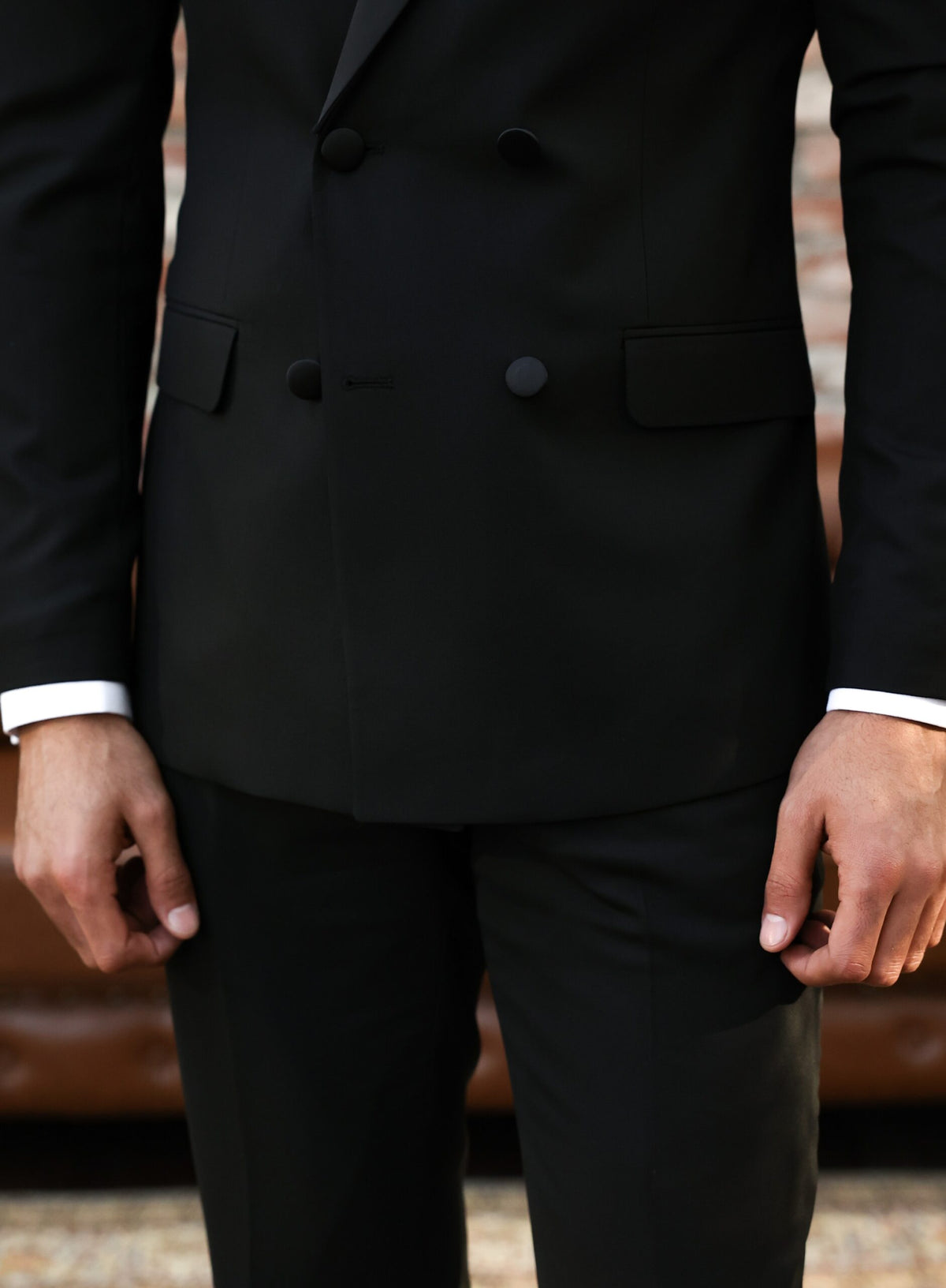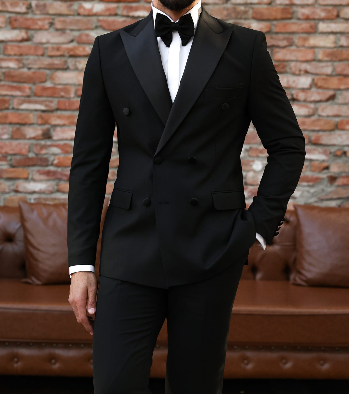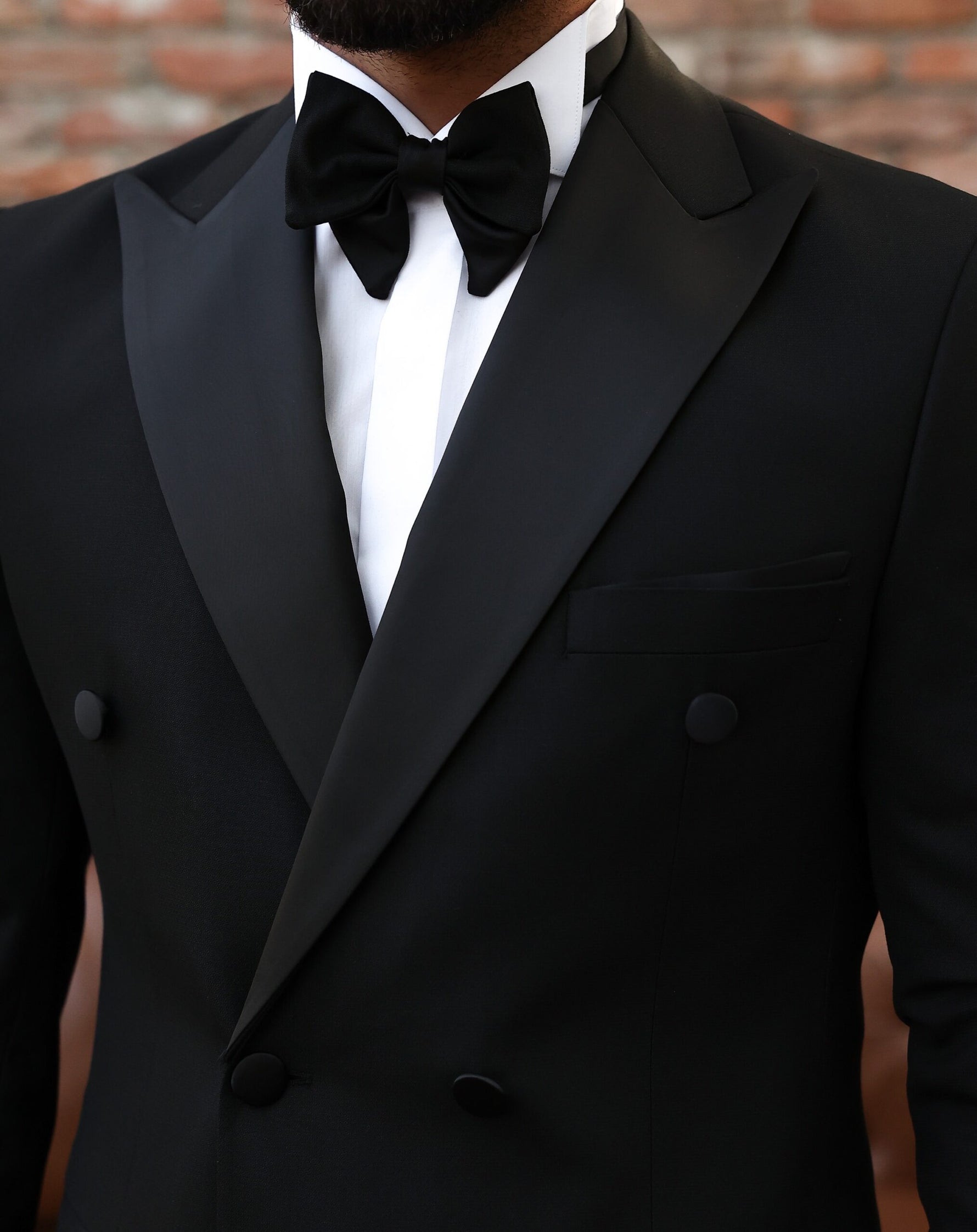 A black double breasted tuxedo with satin lapels is a formal and sophisticated choice for any special occasion. The black colour is chic and timeless, while the satin lapels add a touch of luxury and refinement to the tuxedo. A double breasted tuxedo features overlapping front flaps and two rows of buttons, creating a polished and cohesive look. A tuxedo is a formal suit typically worn to black tie events, such as formal dinners, weddings, and formal dances. It consists of a jacket with lapels, matching trousers, and a formal shirt with a wing collar and studs or buttons. The jacket is traditionally worn with a single button and peaked lapels. The tuxedo is typically worn with a cummerbund or vest, a bow tie, and dress shoes. When paired with the right accessories and attire, a black double breasted tuxedo with satin lapels is sure to make a formal and stylish statement.