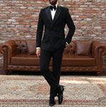 Slim fit all black double breasted two piece men’s tuxedo suit with peak satin lapels