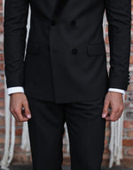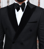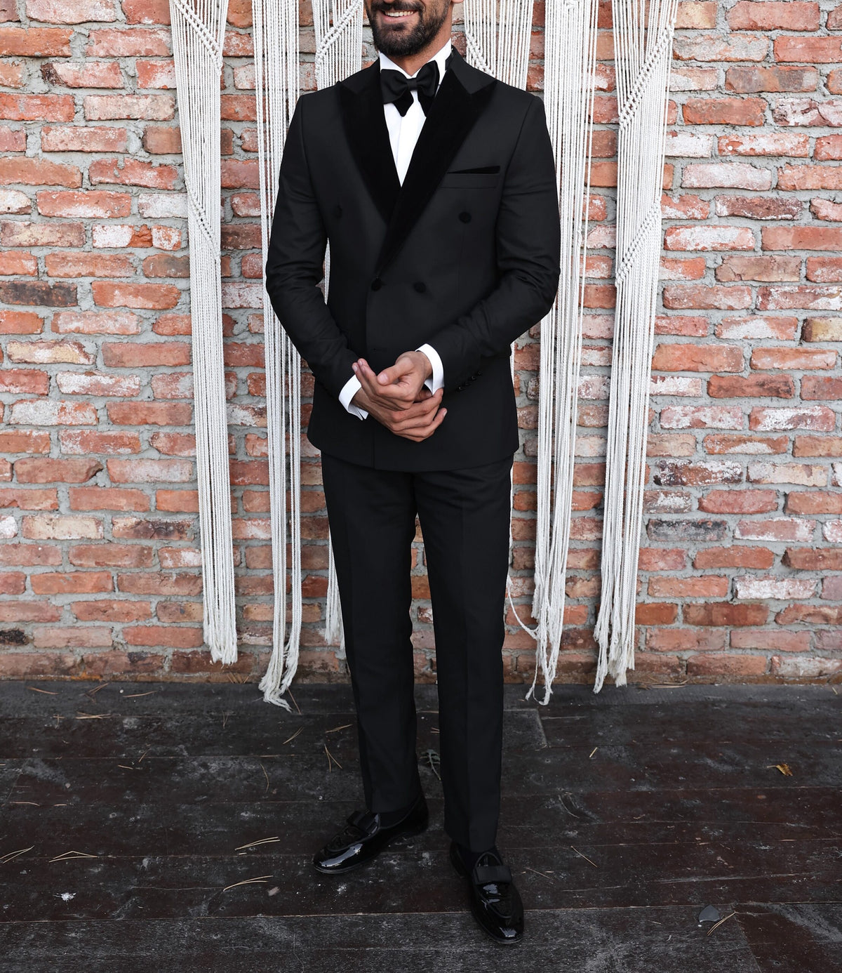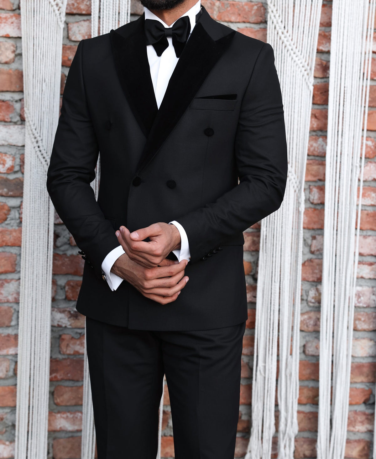 Slim fit all black double breasted two piece men’s tuxedo suit with peak velvet lapels