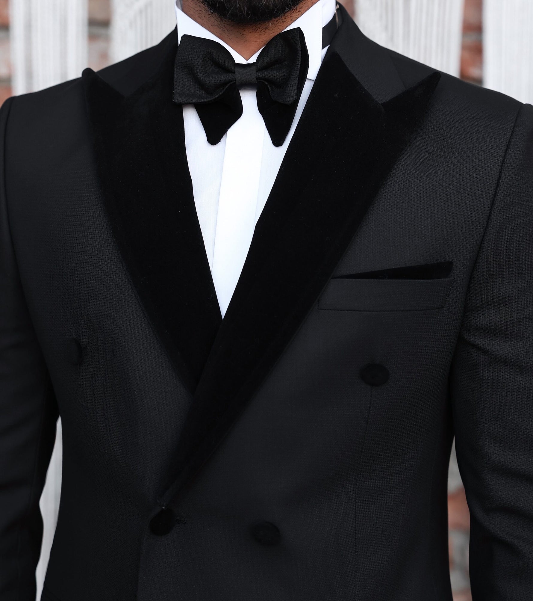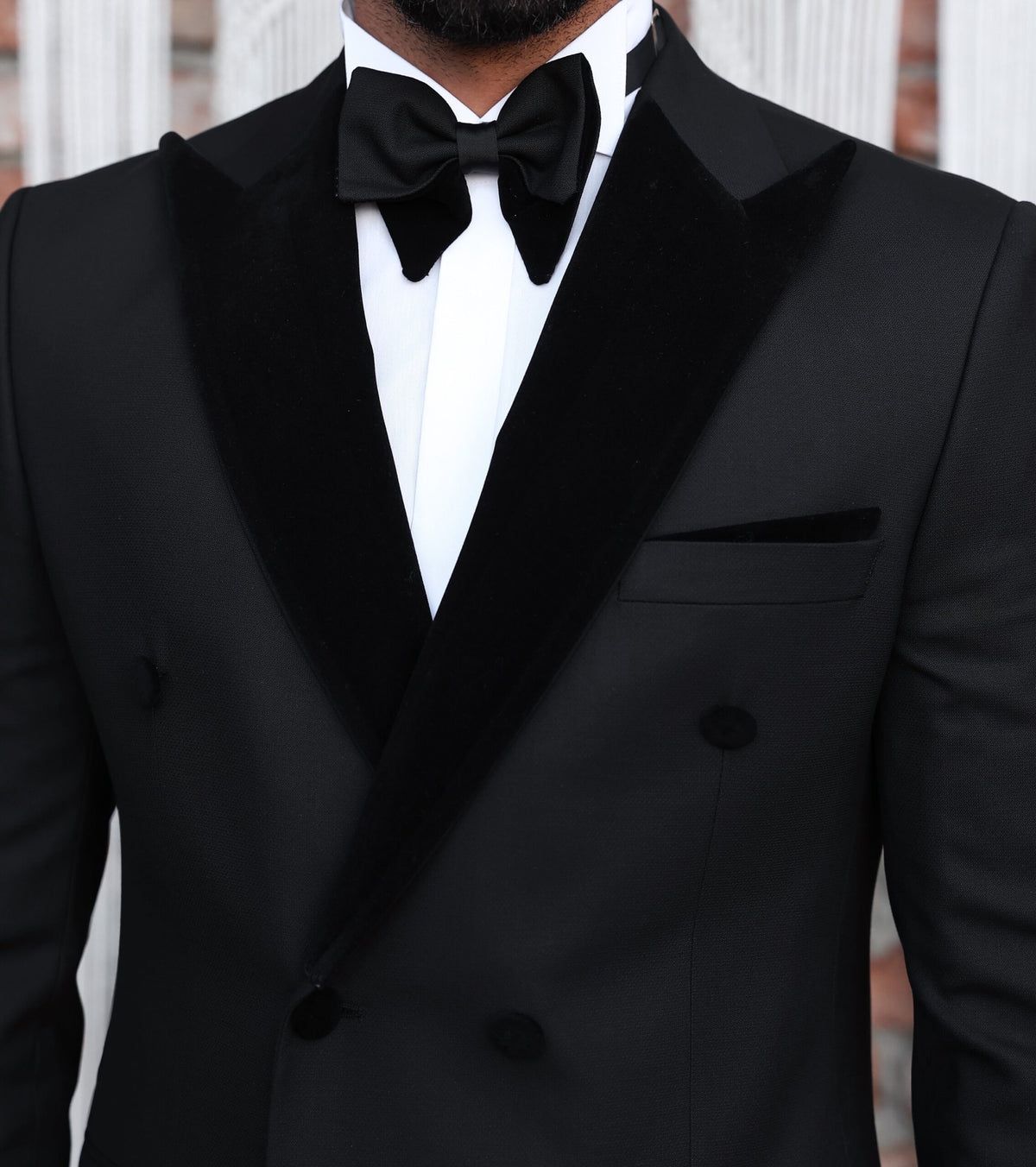 A black double breasted tuxedo with velvet lapels is a formal and luxurious choice for any special occasion. The black colour is chic and sophisticated, and the velvet lapels add a touch of richness and opulence to the tuxedo. A tuxedo is a formal suit typically worn to black tie events, such as formal dinners, weddings, and formal dances. It consists of a jacket with lapels, matching trousers, and a formal shirt with a wing collar and studs or buttons. The jacket is traditionally worn with a single button and peaked lapels. The tuxedo is typically worn with a cummerbund or vest, a bow tie, and dress shoes. When paired with the right accessories and attire, a black double breasted tuxedo with velvet lapels is sure to make a formal and sophisticated statement.