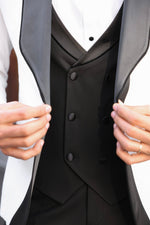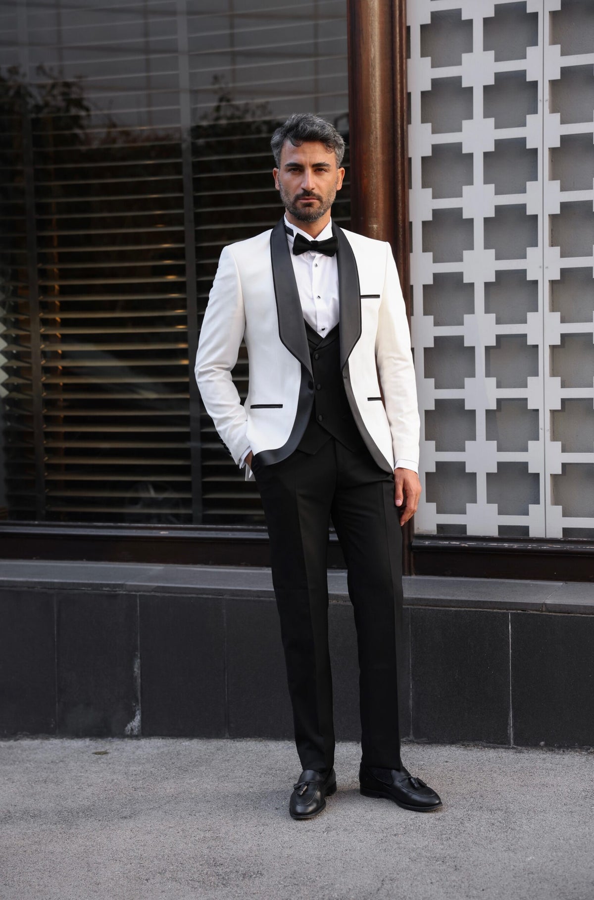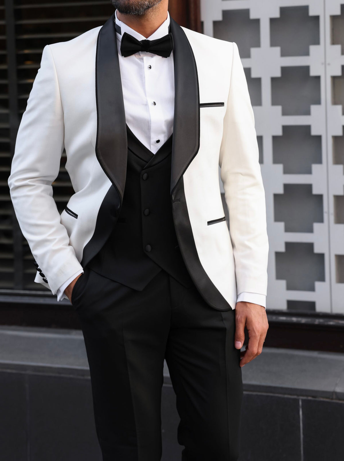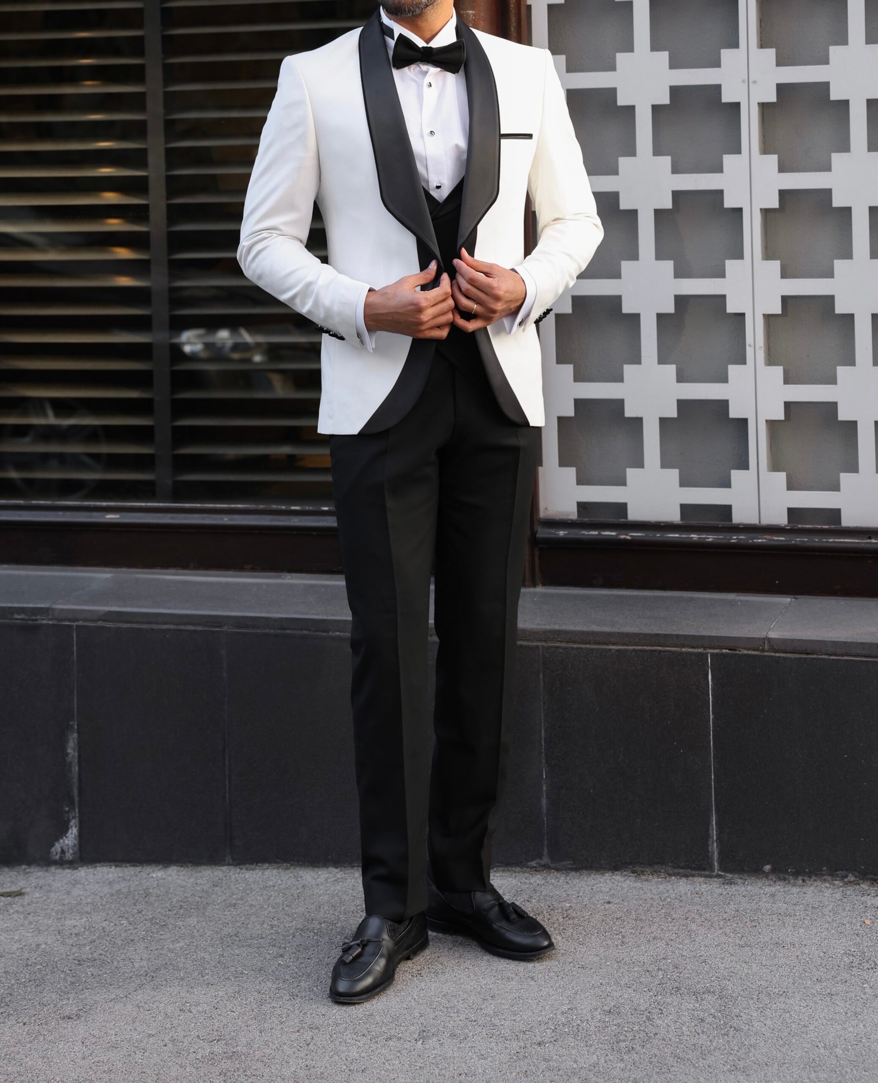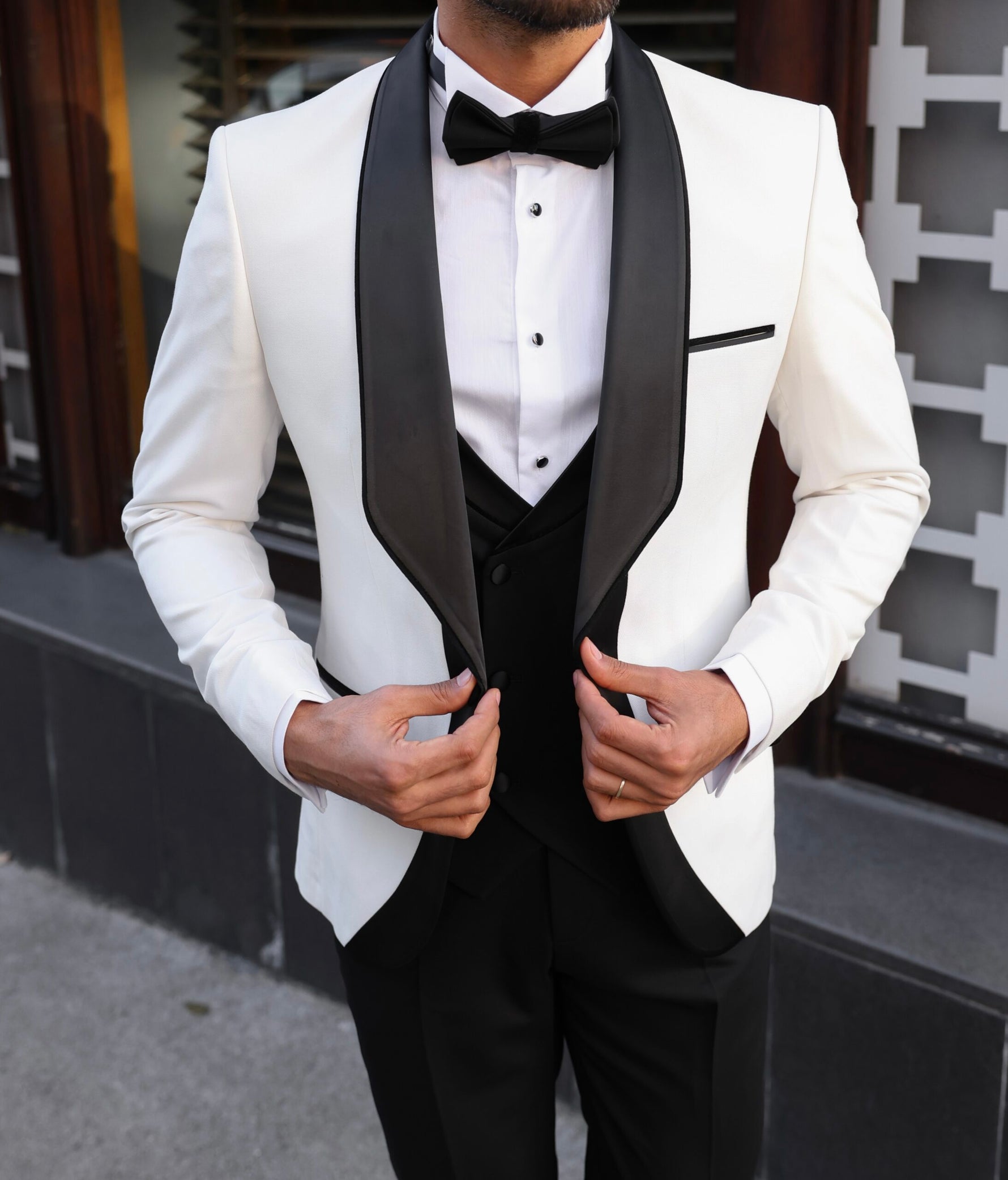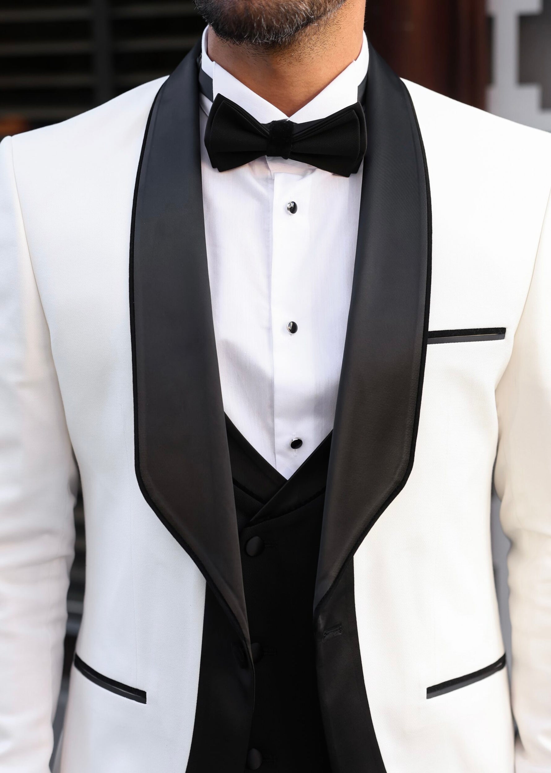 Tailored slim fit white men’s tuxedo with black satin shawl lapels