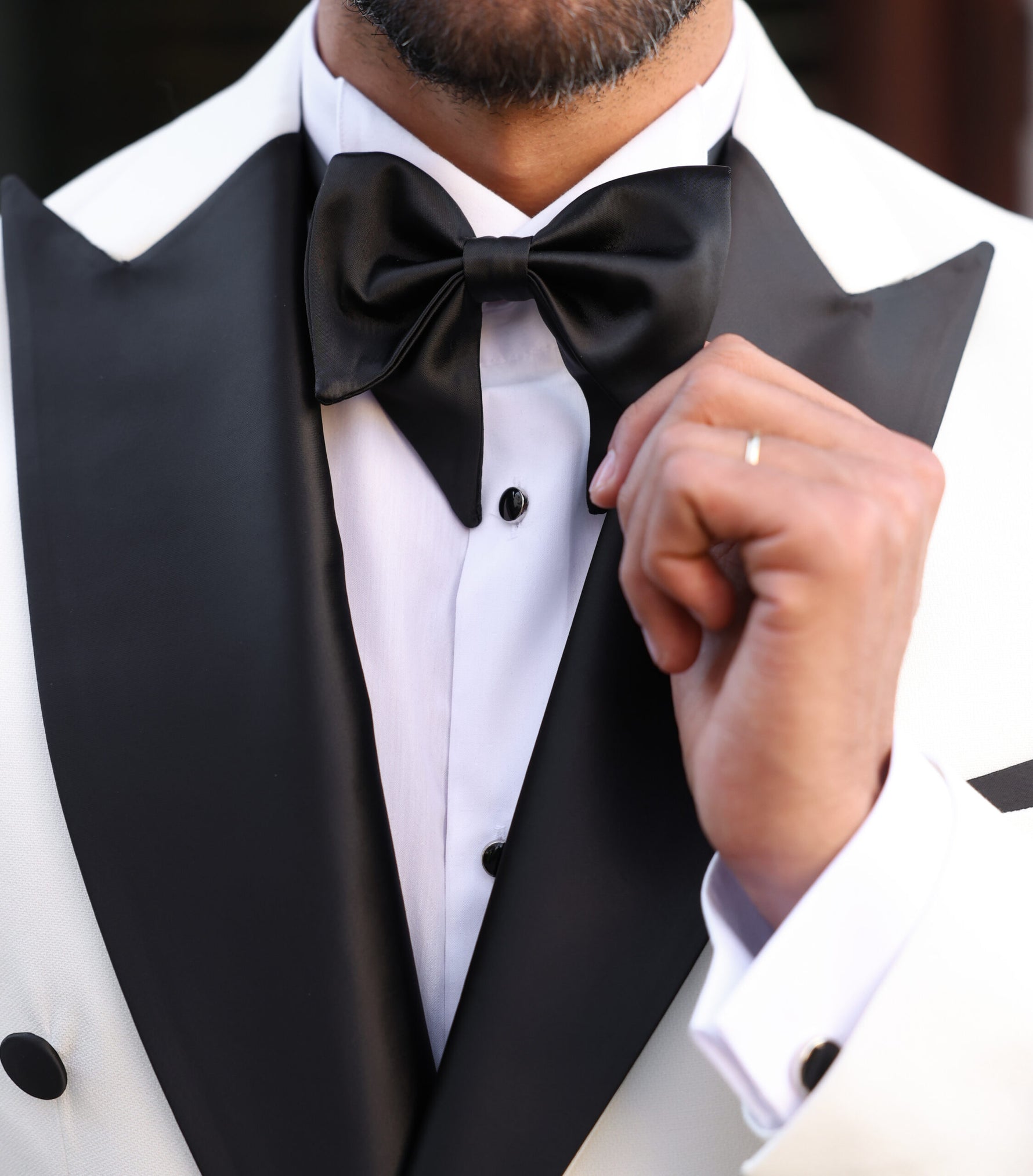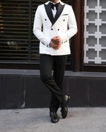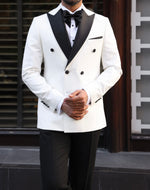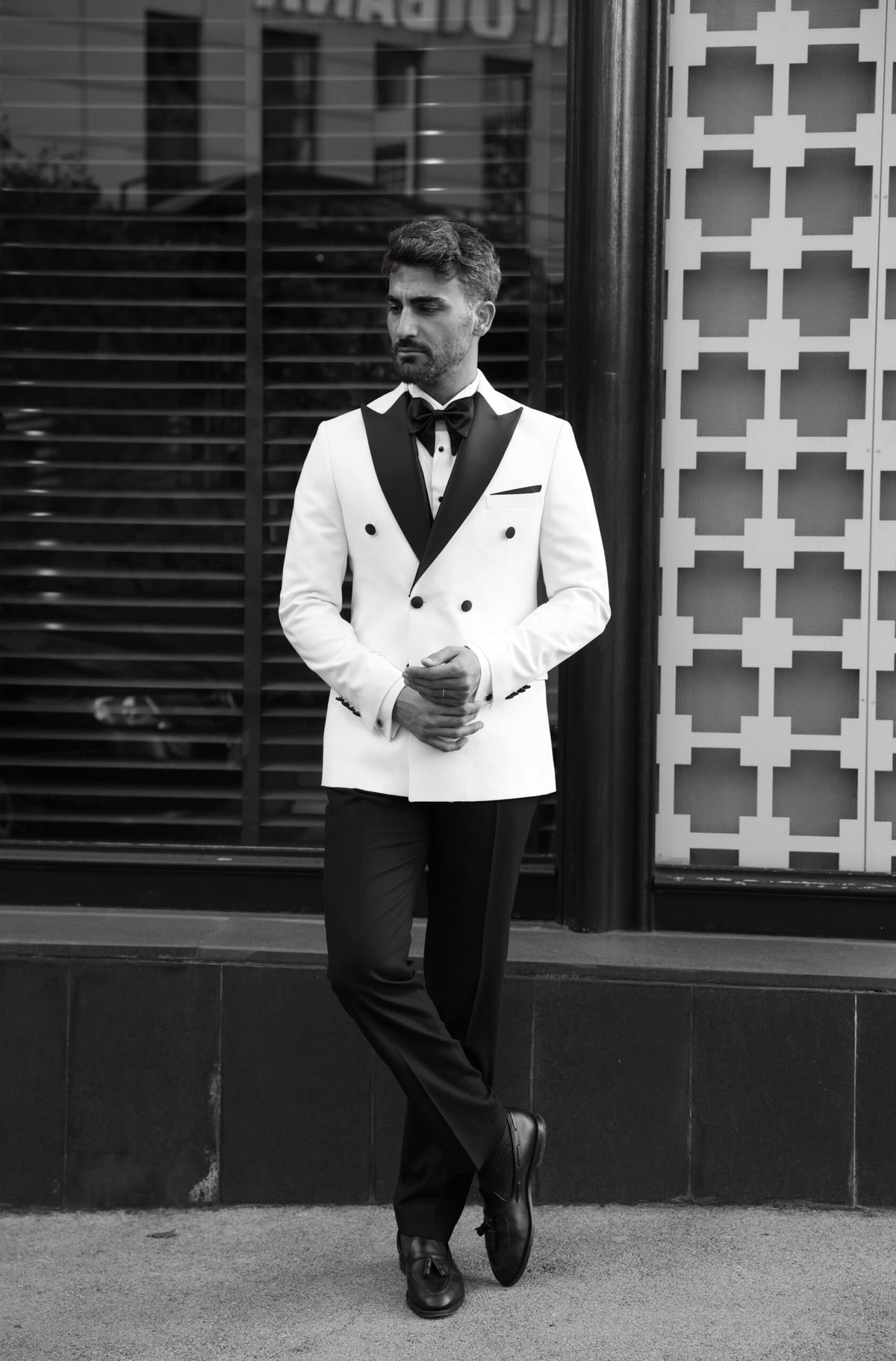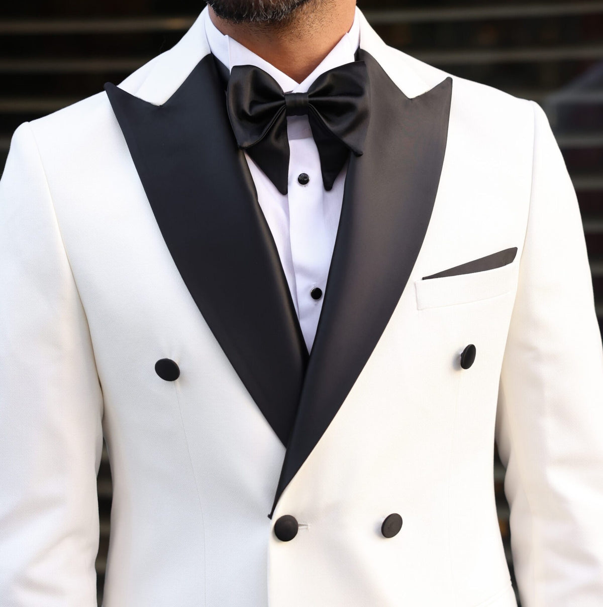 Tailored slim fit white double breasted men’s tuxedo with black satin peak lapels