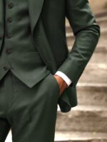 Our slim fit suits are our closest-fitting style, precisely cut for a snug fit through shoulders, chest, arms and thighs. The blazer is fitted through the waist while trousers are neat through the seat and taper towards the ankle to skim top of the shoe.