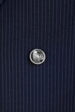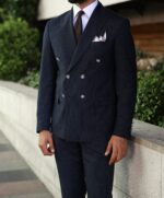 Our dark navy blue pinstriped double-breasted men’s suit exudes an air of timeless elegance and sophistication. Crafted from high-quality fabric, it combines classic tailoring with modern refinement. The deep navy blue adds depth and richness, while the subtle pinstripes provide a touch of understated charm. The double-breasted silhouette enhances the suit’s formality, accentuating the wearer’s masculine silhouette and projecting confidence. Whether worn for a formal event, a business meeting, or a special occasion, this suit commands attention and admiration. Its impeccable craftsmanship, attention to detail, and impeccable fit make it a wardrobe staple for the discerning gentleman who appreciates both style and substance.