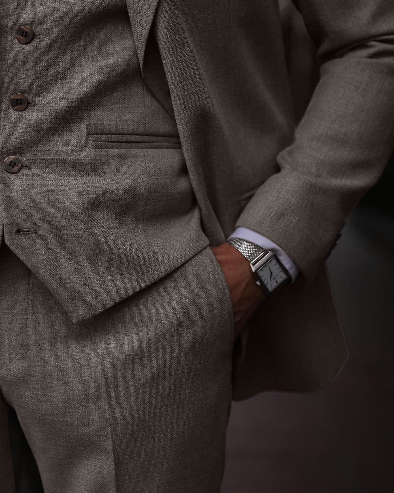 Our slim fit suits are our closest-fitting style, precisely cut for a snug fit through shoulders, chest, arms and thighs. The blazer is fitted through the waist while trousers are neat through the seat and taper towards the ankle to skim top of the shoe.