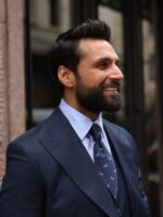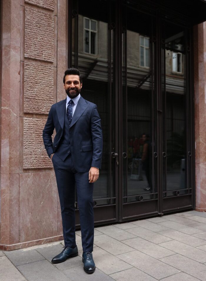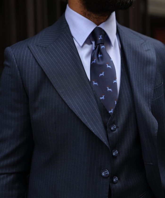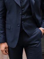 Our slim fit suits are our closest-fitting style, precisely cut for a snug fit through shoulders, chest, arms and thighs. The blazer is fitted through the waist while trousers are neat through the seat and taper towards the ankle to skim top of the shoe.