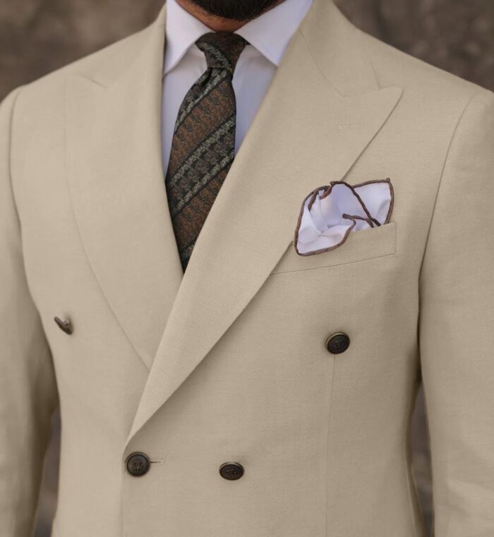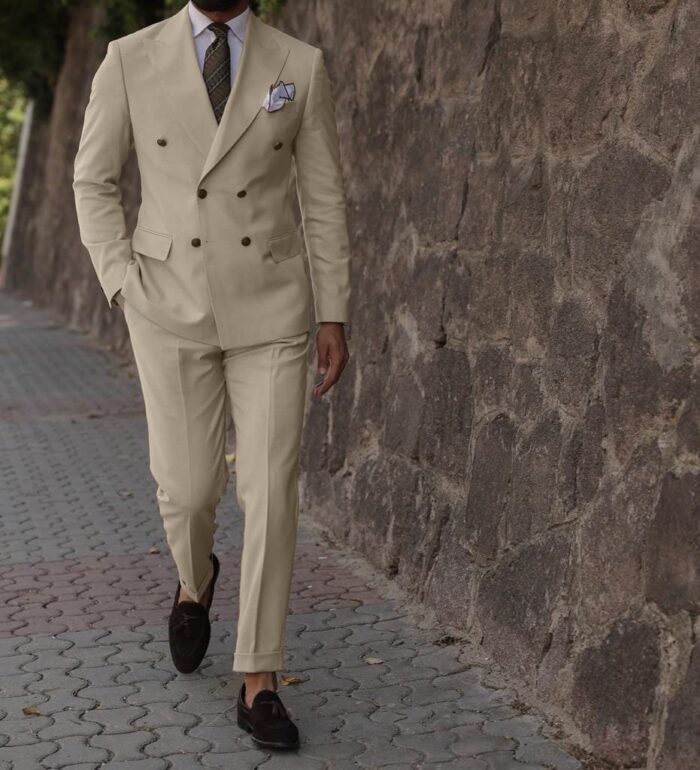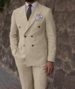 Show off your style in this stylish and sophisticated men’s slim-fit, all-cream double-breasted two-piece suit. Made from high-quality fabric, this suit is designed to provide a sharp, modern silhouette that fits to perfection. The front of the trousers has a straight and narrow cut; This is perfect for creating a polished finish that is both modern and classic.