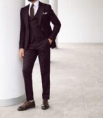 Our slim fit suits are our closest-fitting style, precisely cut for a snug fit through shoulders, chest, arms and thighs. The blazer is fitted through the waist while trousers are neat through the seat and taper towards the ankle to skim top of the shoe.