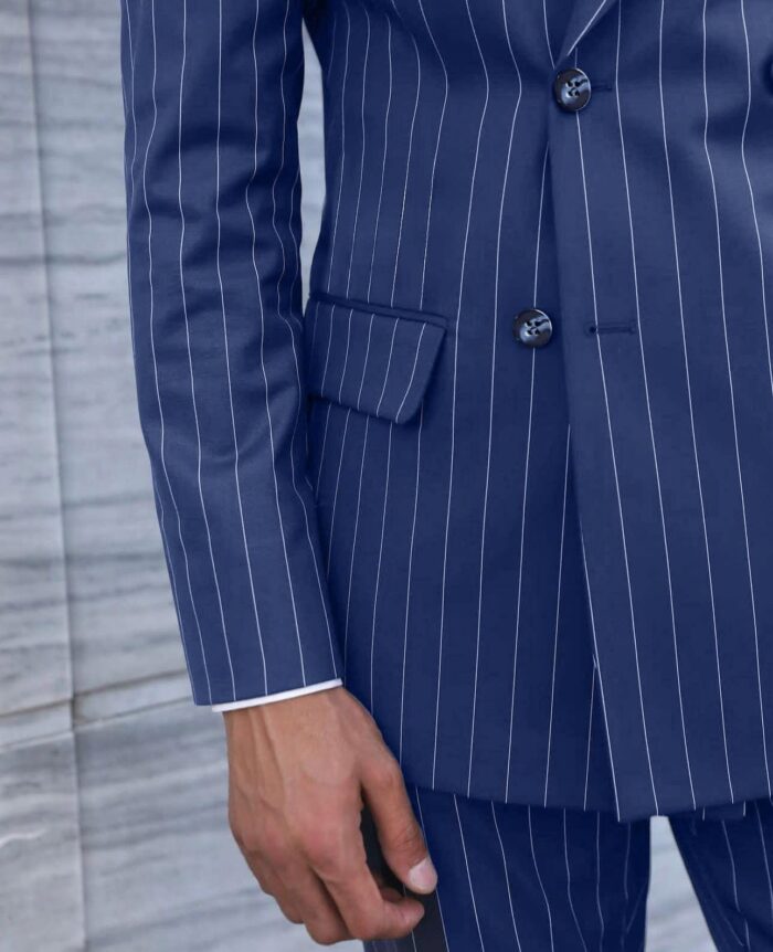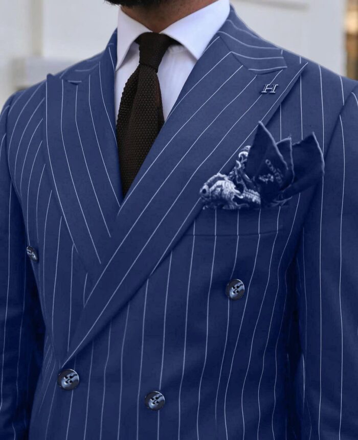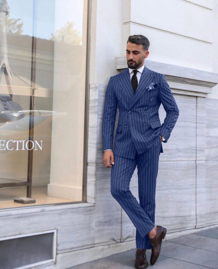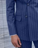 This suit can be paired with a crisp white shirt and a dark tie to create a polished, professional look. It can also be dressed down with a light-coloured shirt and no tie for a more relaxed yet still stylish appearance. Overall, the steel blue pinstripe double-breasted suit with peak lapels is a versatile and stylish addition to any modern man’s wardrobe.