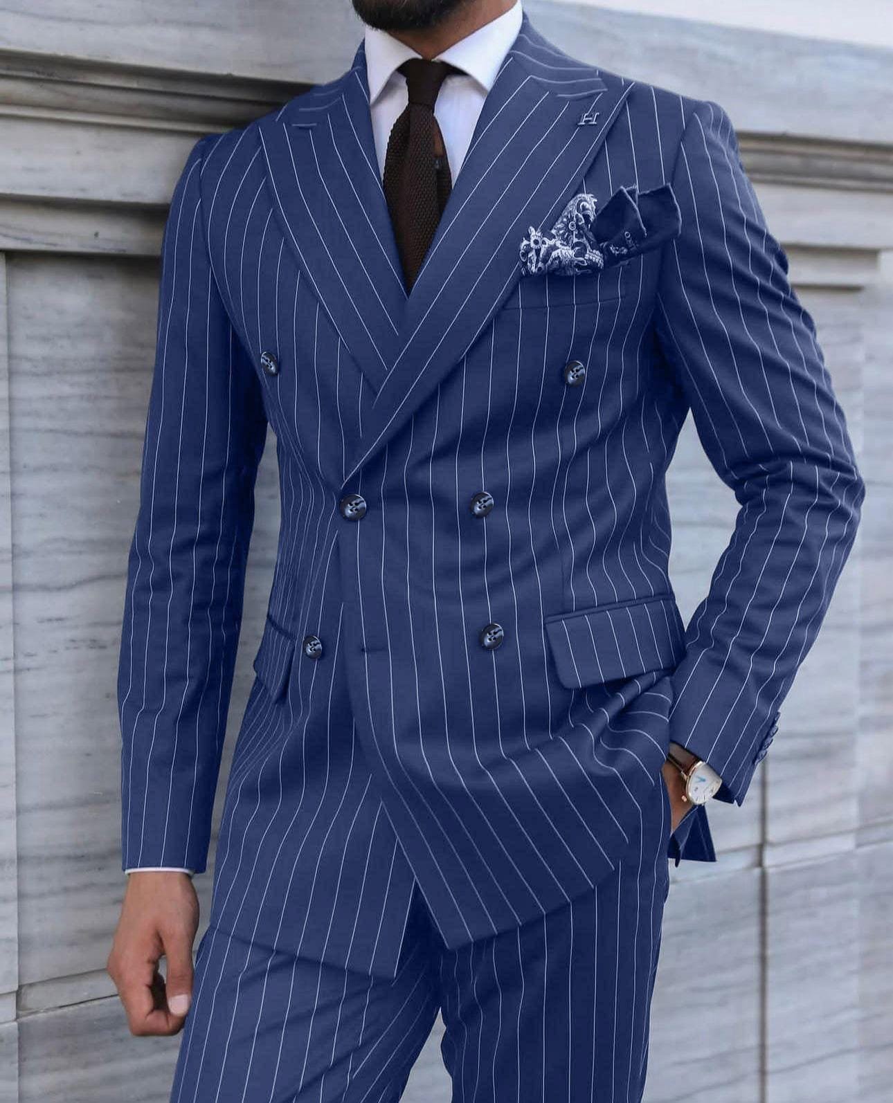 A double-breasted suit with peak lapels is a timeless classic, and this steel blue pinstripe version is no exception. The tailored slim fit creates a sharp, modern silhouette that is sure to impress in any formal setting.