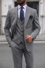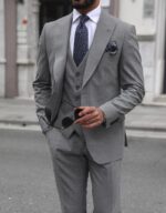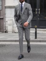 Our slim fit suits are our closest-fitting style, precisely cut for a snug fit through shoulders, chest, arms and thighs. The blazer is fitted through the waist while trousers are neat through the seat and taper towards the ankle to skim top of the shoe.