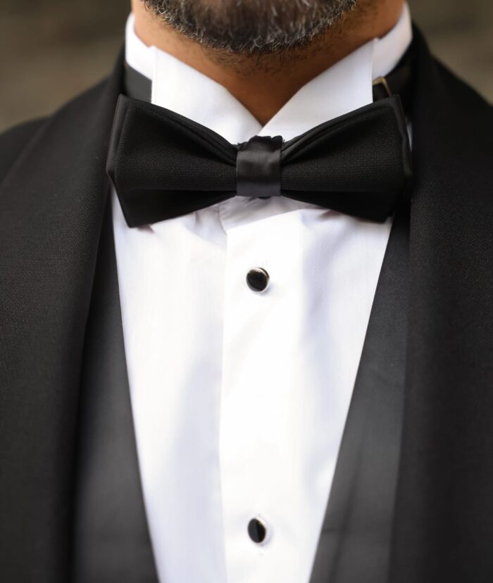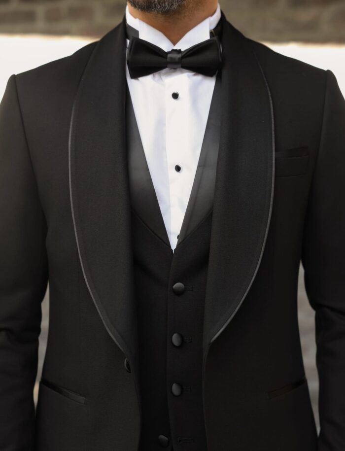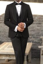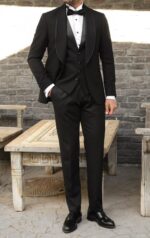 A black tuxedo is a formal and luxurious choice for any special occasion. The black colour is deep and rich, while the adds a touch of opulence and richness to the tuxedo. Black trousers provide a sleek and sophisticated base for the ensemble. A tuxedo is a formal suit typically worn to black tie events, such as formal dinners, weddings, and formal dances. It consists of a jacket with lapels, matching trousers, and a formal shirt with a wing collar and studs or buttons. The jacket is traditionally worn with a single button and peaked lapels. The tuxedo is typically worn with a cummerbund or vest, a bow tie, and dress shoes. When paired with the right accessories and attire, black tuxedo with black trousers is sure to make a formal and stylish statement.