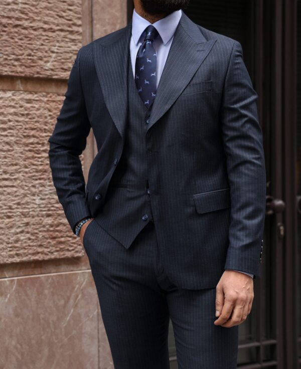 Our slim fit suits are our closest-fitting style, precisely cut for a snug fit through shoulders, chest, arms and thighs. The blazer is fitted through the waist while trousers are neat through the seat and taper towards the ankle to skim top of the shoe.