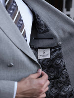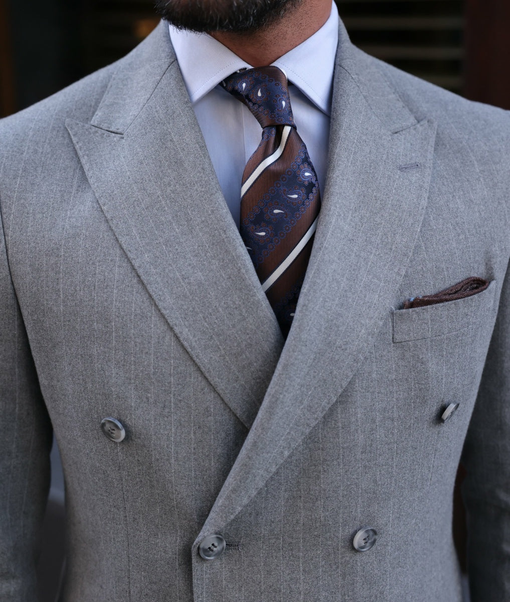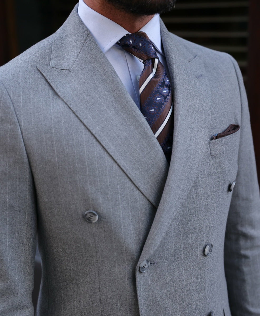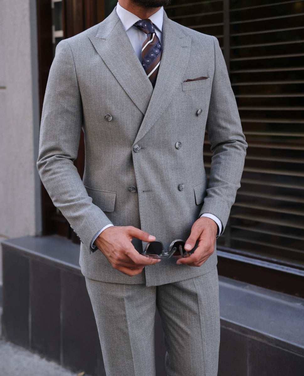 A grey pinstriped double breasted suit can be a stylish and sophisticated choice for formal occasions or business events. The grey colour is a versatile and neutral shade that can be paired with a variety of dress shirts and ties. The pinstripes add a classic touch of visual interest to the suit. A double breasted suit has a more formal look, with overlapping front flaps and two rows of buttons.