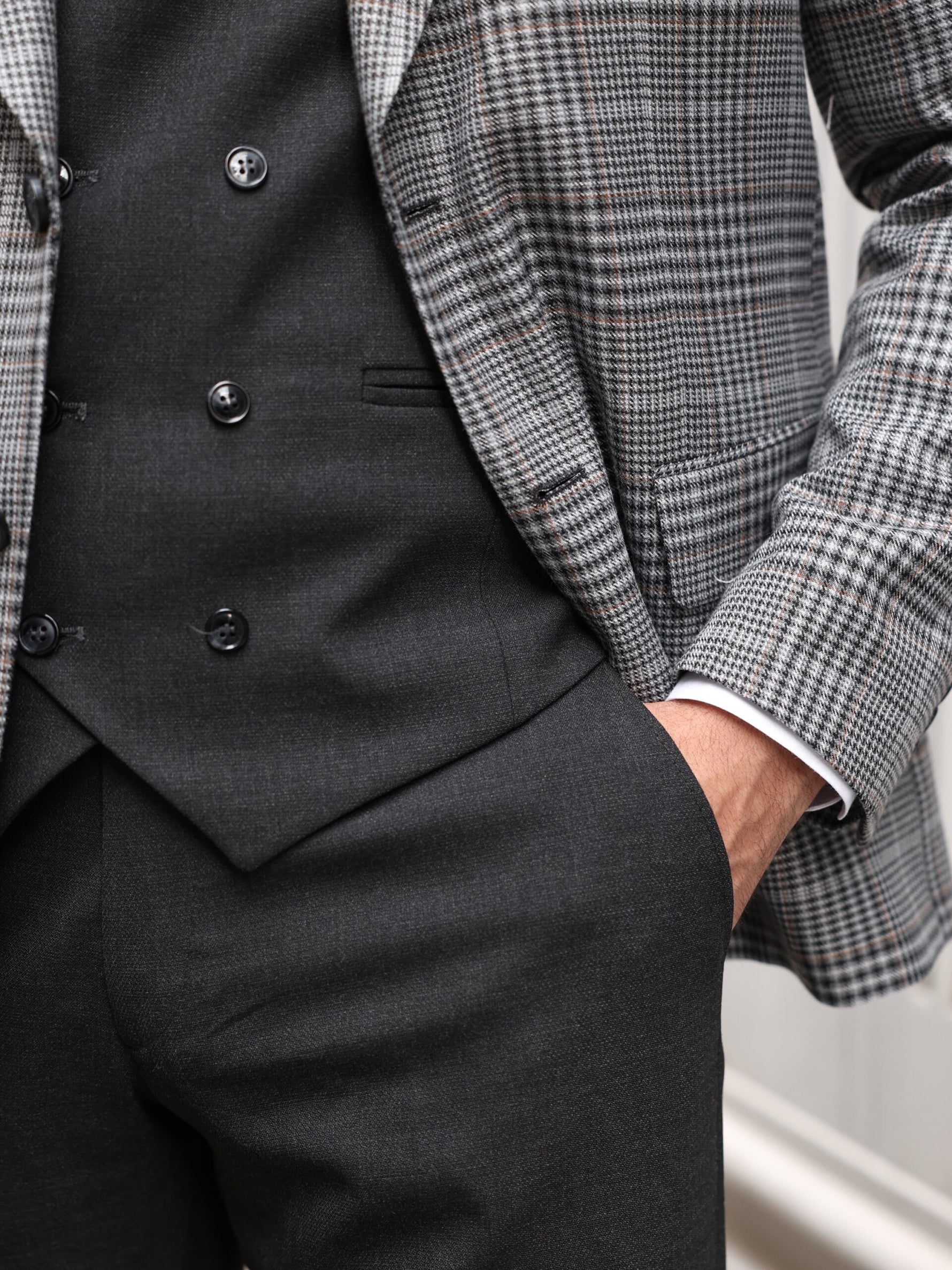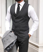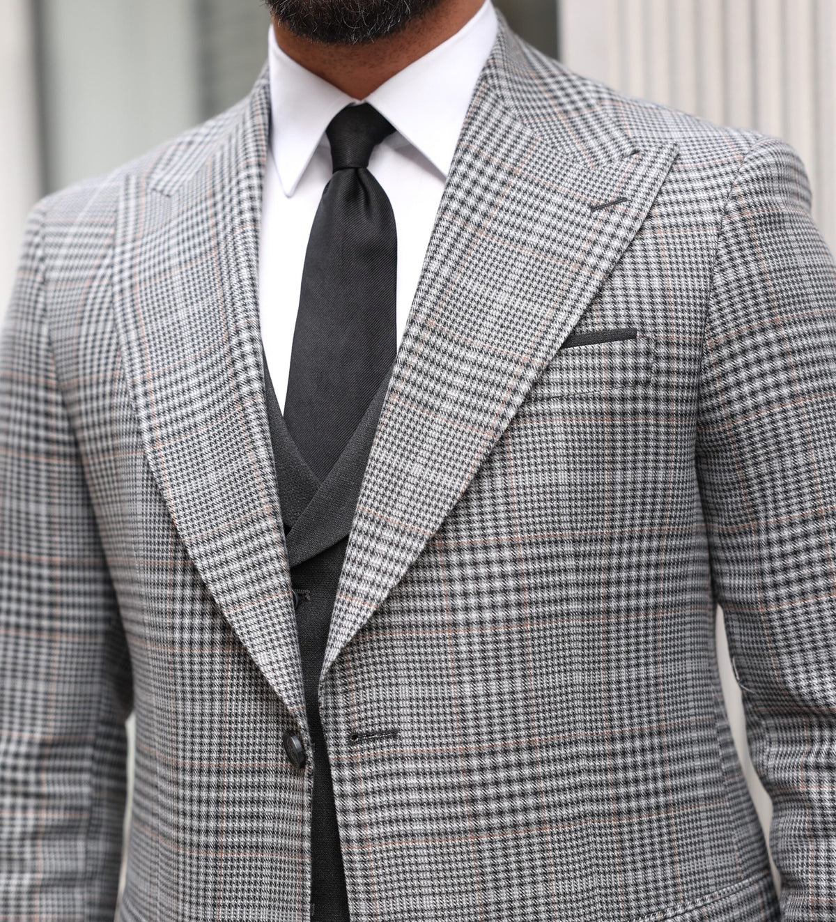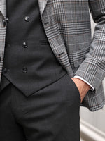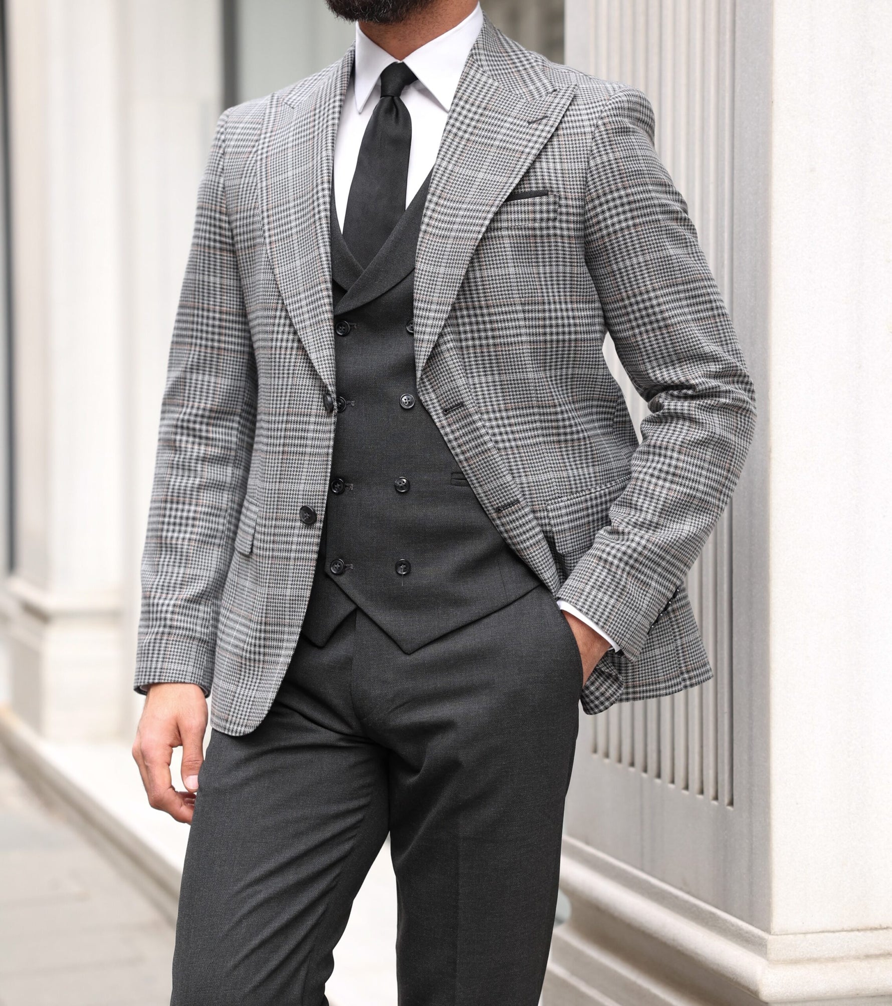 Slim fit light grey and charcoal chequered mixed three piece suit with a double breasted waistcoat and peak lapels