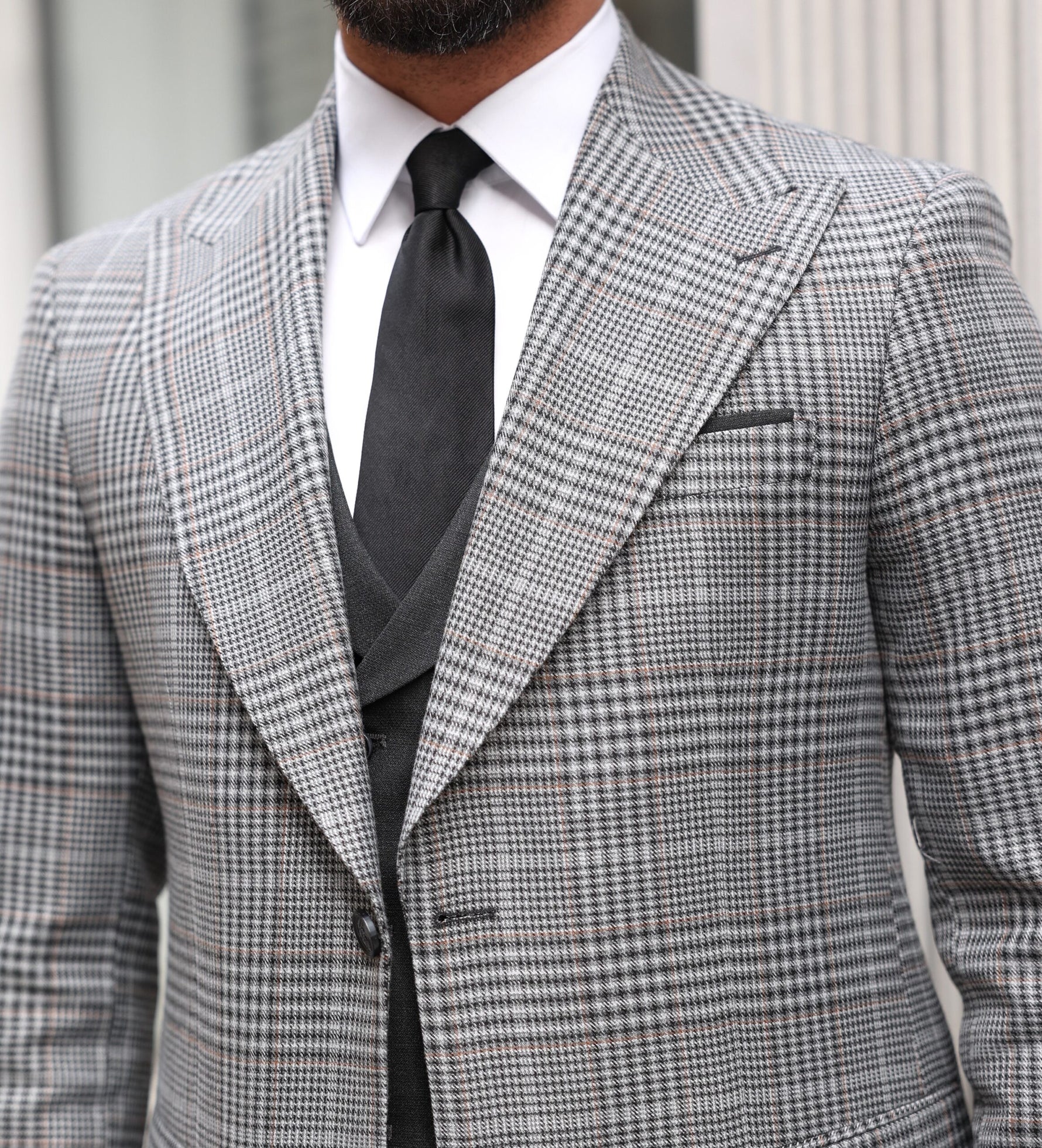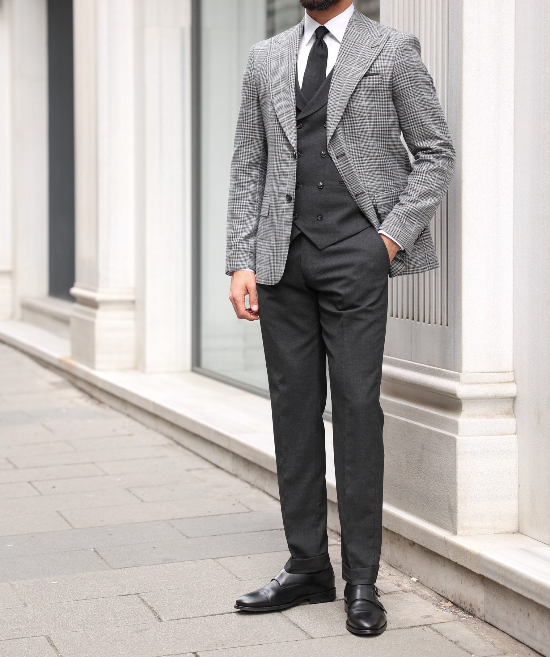 Introducing the ultimate combination of sophistication and style – the slim fit light grey and charcoal chequered mixed three-piece suit with a double-breasted waistcoat and peak lapels! This suit is sure to turn heads and make a bold statement at any formal event. The striking contrast between the light grey and charcoal chequered pattern creates a stunning and unique look that will have all eyes on you. The double-breasted waistcoat and peak lapels add a classic touch of sophistication, while the slim fit cut of the suit creates a modern and sleek silhouette. Whether it’s a wedding, business meeting, or any other special occasion, this high-quality and stylish suit is the perfect choice for the fashion-forward man who wants to make an unforgettable impression. Don’t miss out on the chance to elevate your wardrobe to the next level with this must-have suit!