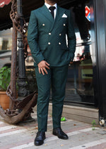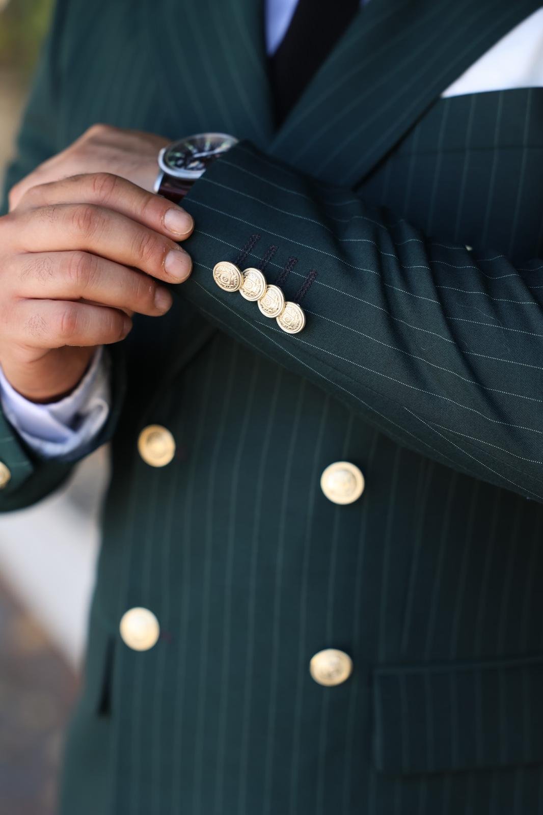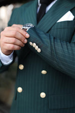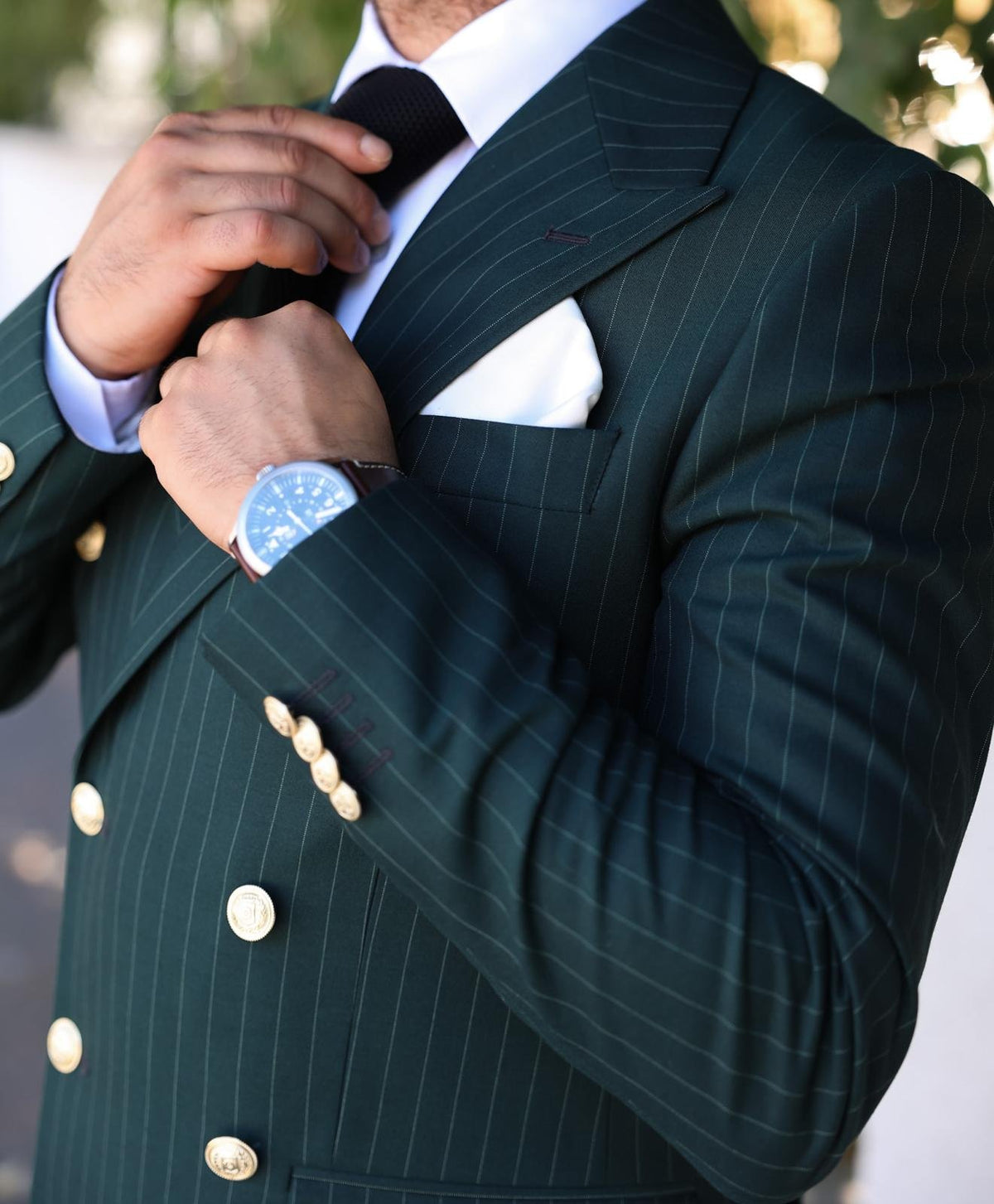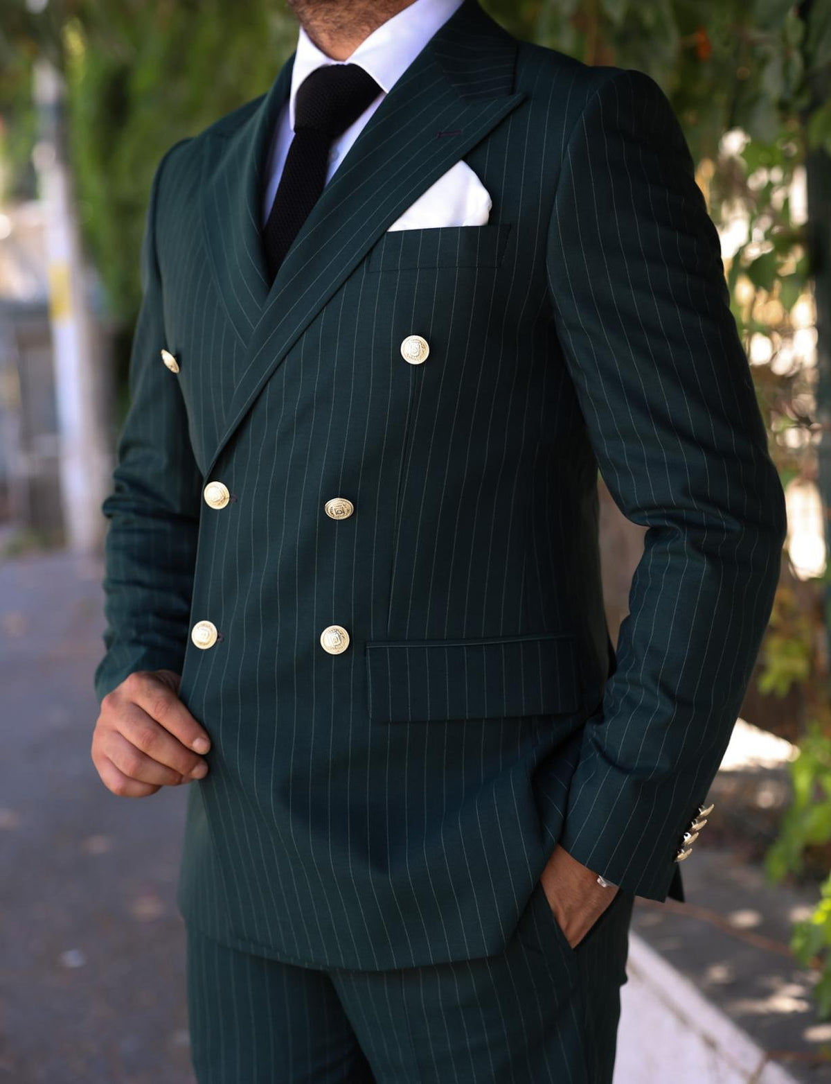 Tailored slim fit pine green pinstripe double breasted men’s suit with peak lapels with decorative gold buttons