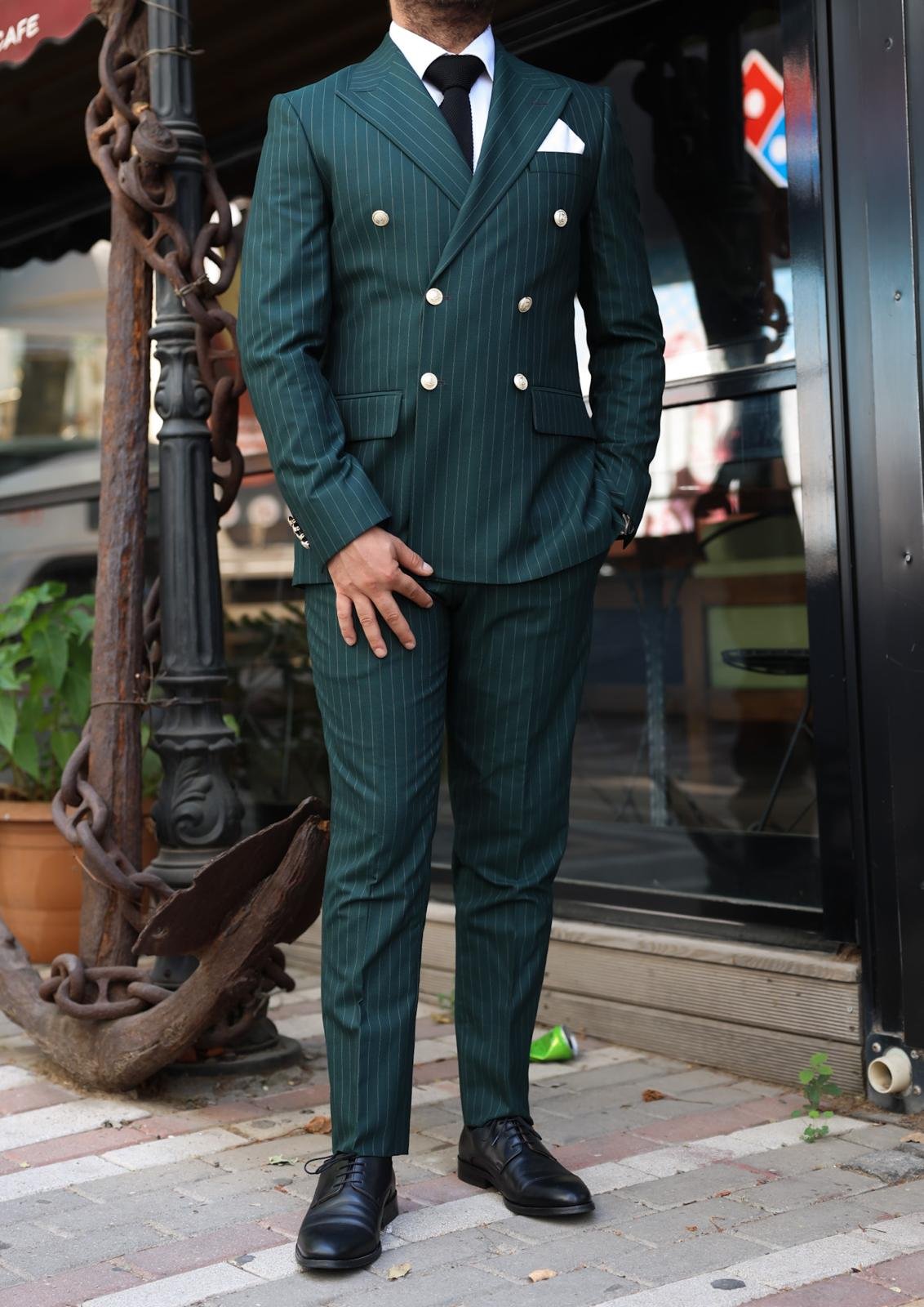 Unveil your distinctive fashion sense with a tailored slim fit pine green pinstripe double-breasted men’s suit. The exquisite pinstripe pattern adds a hint of sartorial flair, while the double-breasted design and peak lapels exude timeless sophistication.Adorned with decorative gold buttons, the suit exudes opulence and style. Ideal for upscale occasions or stylish business events, this suit effortlessly balances modern style with classic charm. The rich pine green hue offers a refreshing twist, setting you apart from the crowd. Elevate your ensemble further with complementary accessories and confidently showcase your unique elegance. Embrace the fusion of tradition and contemporary fashion with this remarkable pinstriped masterpiece.