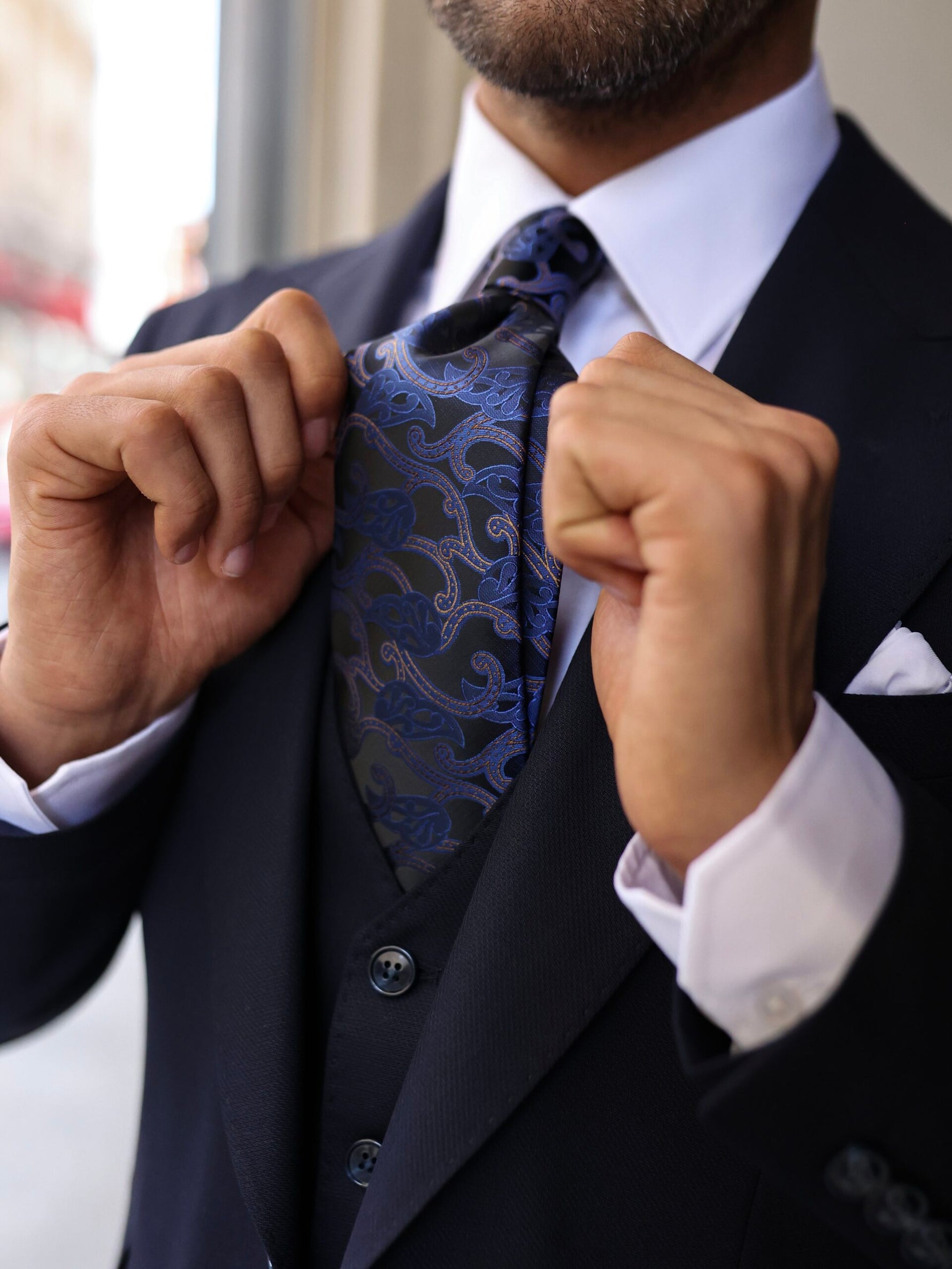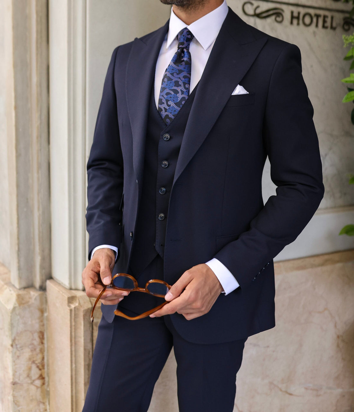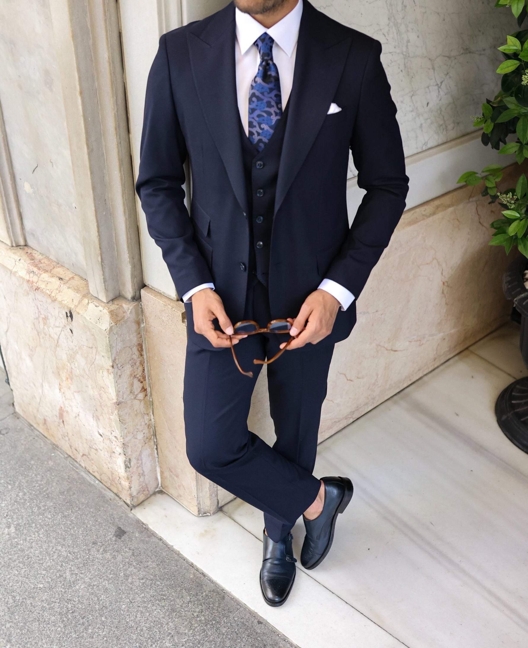 A navy three-piece slim fit suit is a versatile and stylish option for both formal and semi-formal occasions. The slim fit of the suit creates a modern silhouette that flatters the body, while the three-piece design adds an element of sophistication. The navy colour is a classic choice that works well with a variety of shirt and tie combinations, making it easy to dress up or down. Pair it with black leather shoes and a white dress shirt for a formal event, or with a patterned shirt and colourful tie for a more casual look. Overall, this suit is a wardrobe staple that can be worn for years to come.