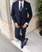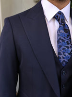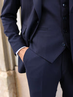 Slim fit dark navy blue men’s three piece suit with peak lapels
