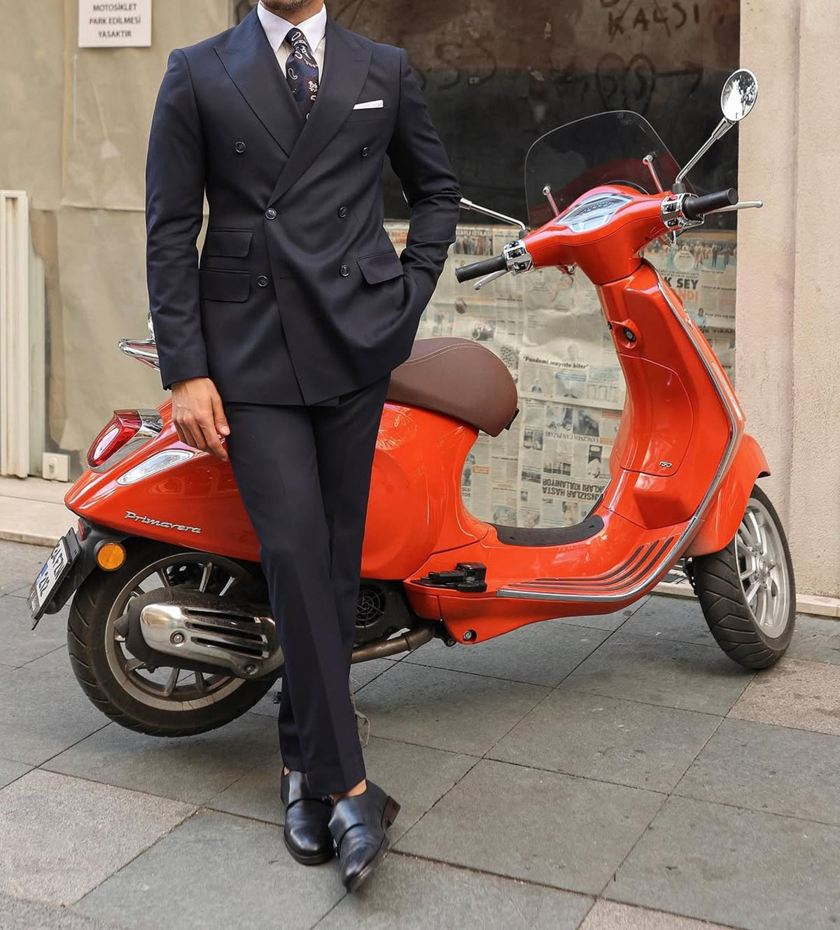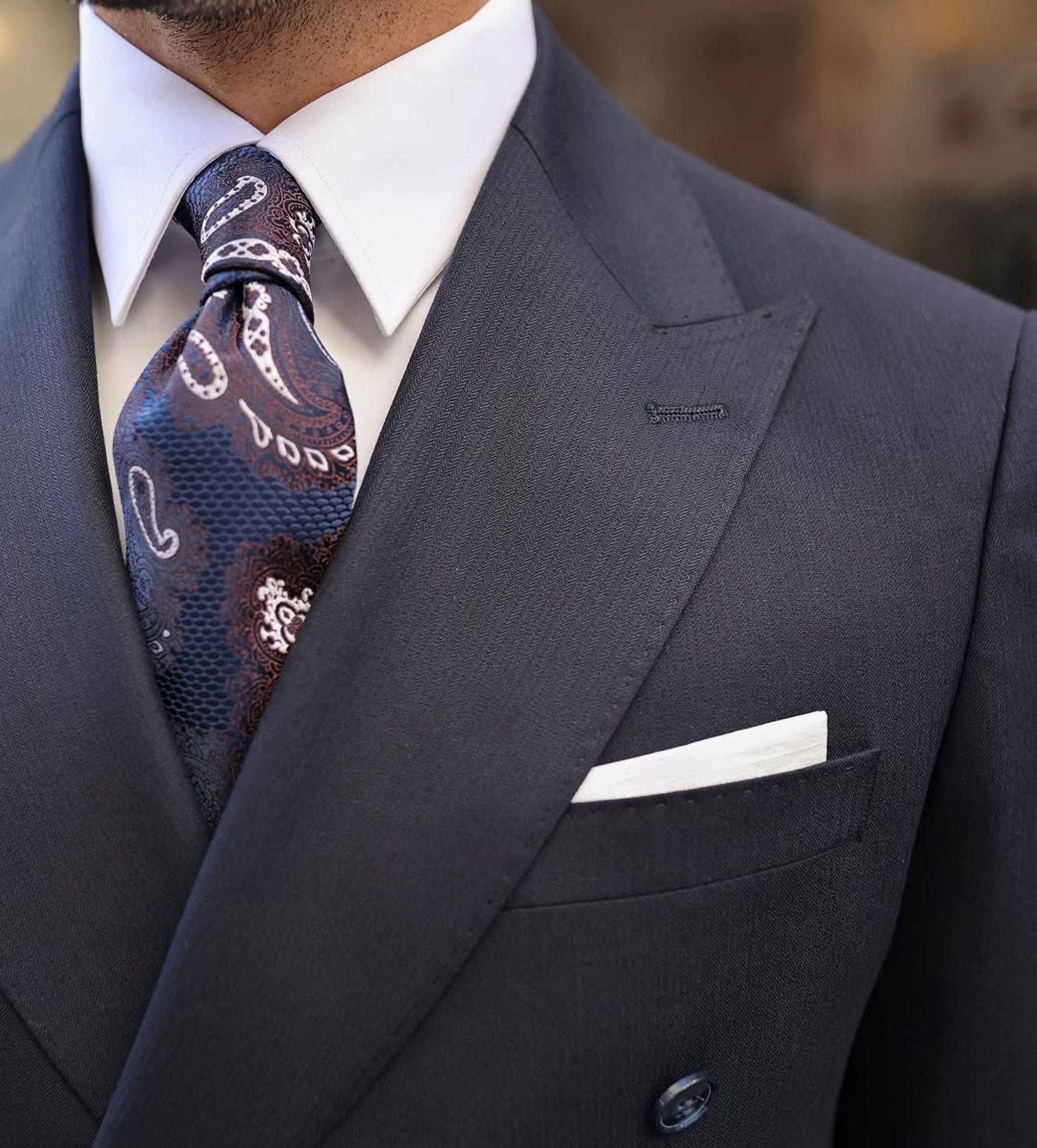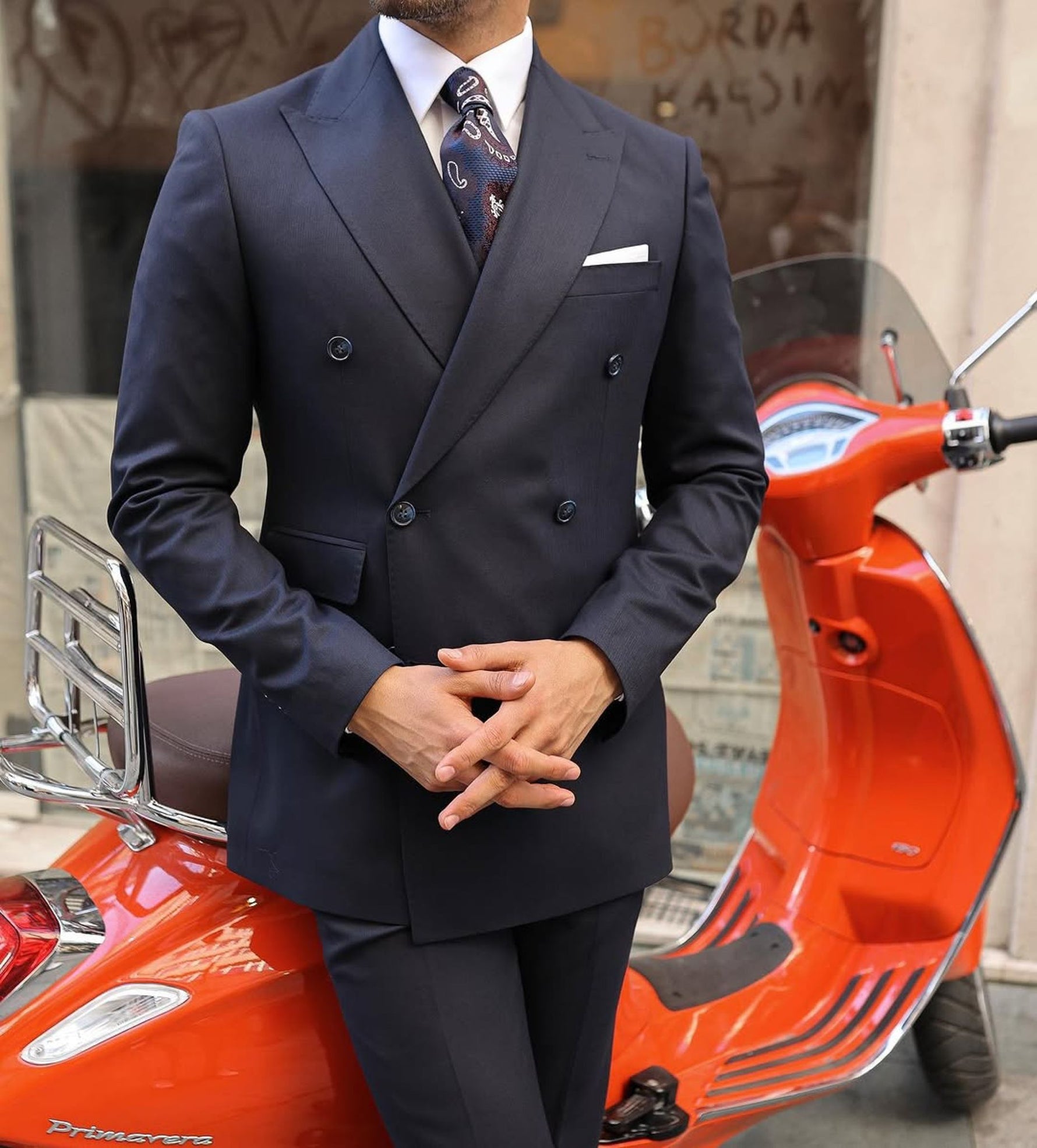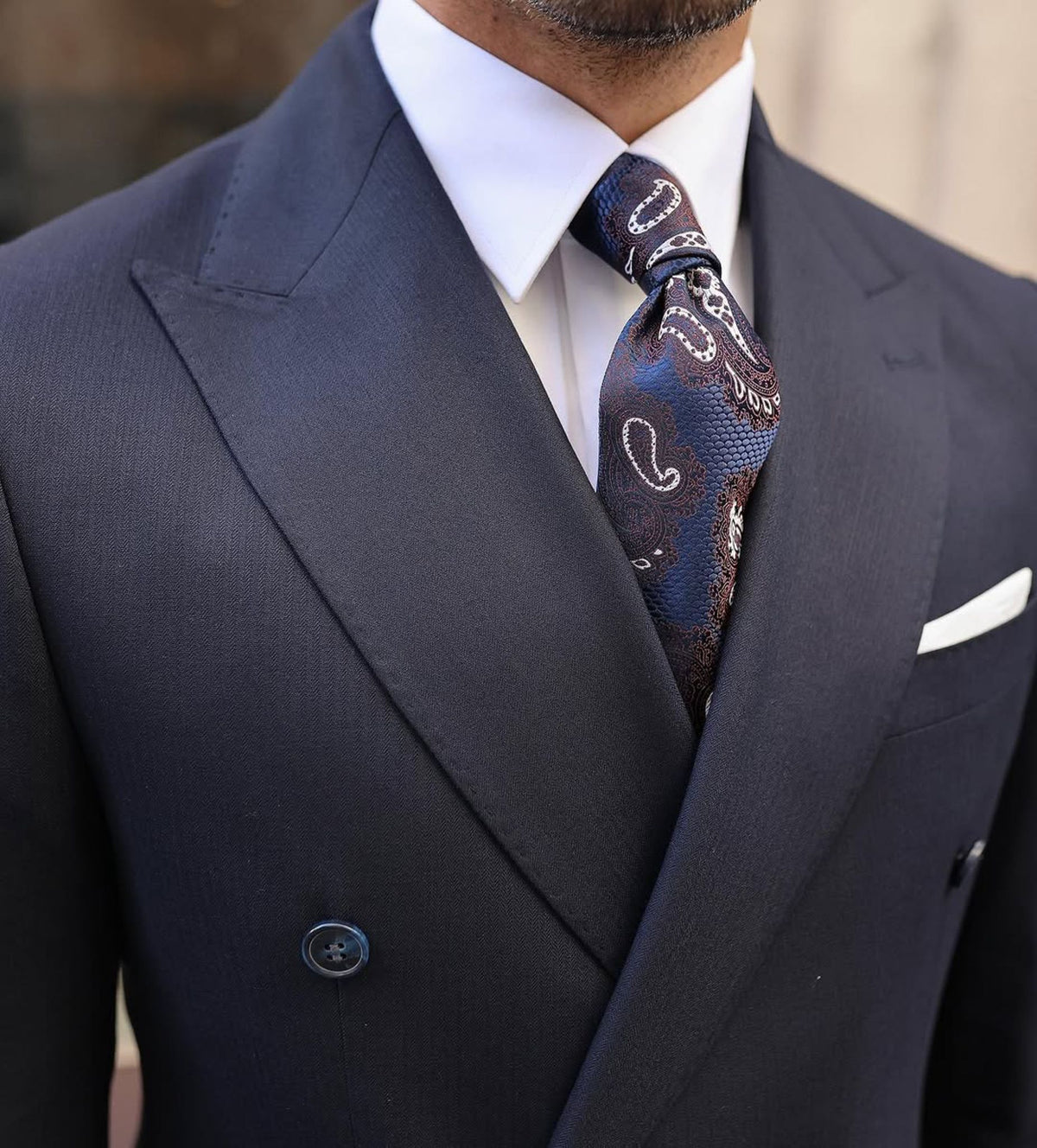 A tailored slim fit dark blue double-breasted men’s suit with peak lapels is a timeless and stylish choice for formal events or business settings. The dark blue colour offers a classic and versatile look, while the double-breasted design and peak lapels add a touch of traditional elegance. Pair it with a white dress shirt, a patterned tie, and black dress shoes for a sophisticated finish. It’s important to ensure that the suit fits perfectly for a sharp and polished appearance.