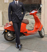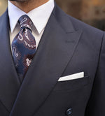 Tailored slim fit dark blue double breasted men’s suit with peak lapels
